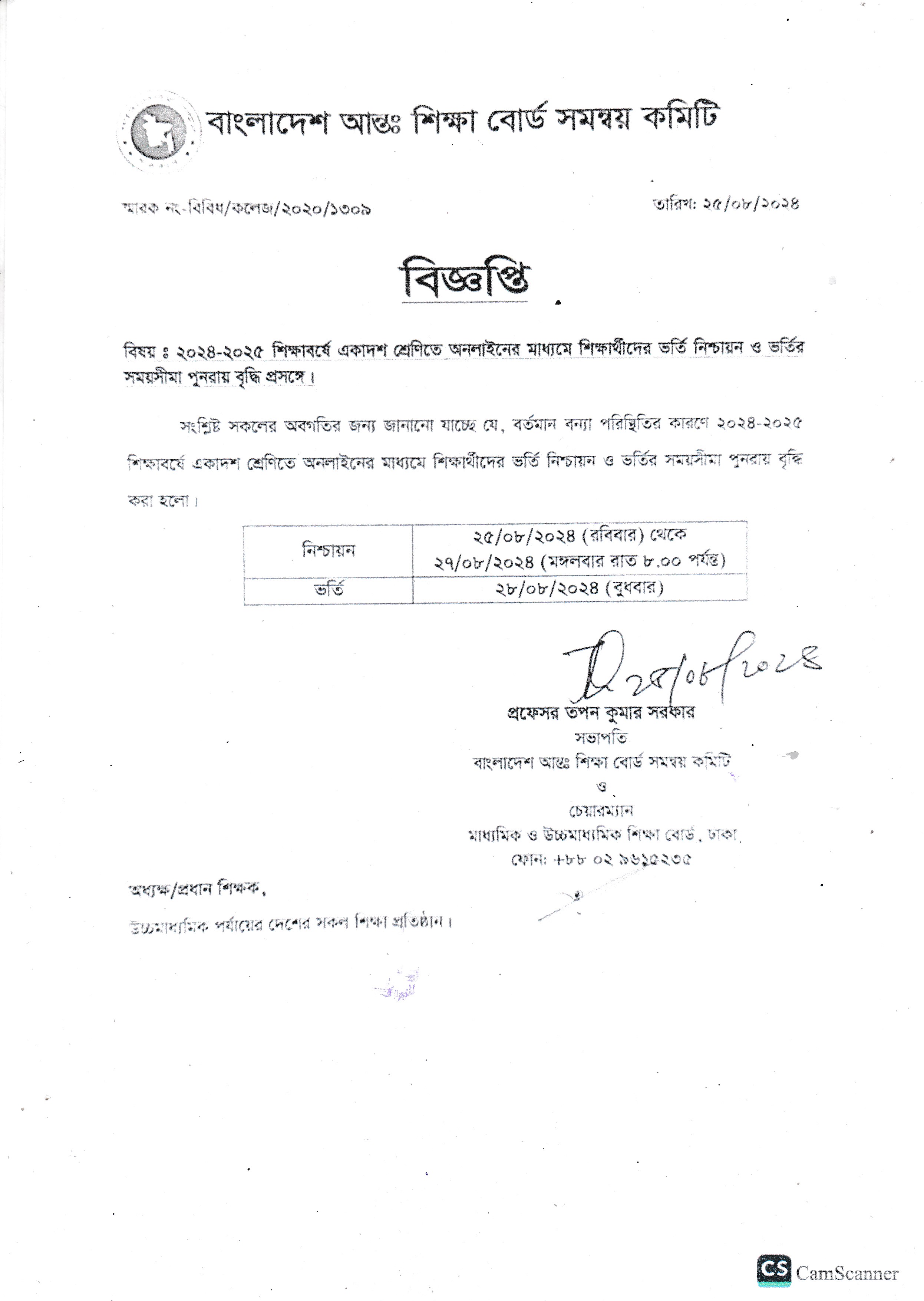 আন্তঃ শিক্ষা বোর্ডের মৌখিক নির্দেশনা মোতাবেক ২০২৪-২০২৫ শিক্ষাবর্ষের একাদশ শ্রেণির ৪র্থ পর্যায়ের ভর্তি নিশ্চয়ন সময়সীমা বৃদ্ধি করে ২৬/০৮/২০২৪ তারিখ, রাত ৮.০০ টা পর্যন্ত এবং কলেজ ভর্তি ২৭/০৮/২০২৪ তারিখ নির্ধারণ করা হয়েছে।