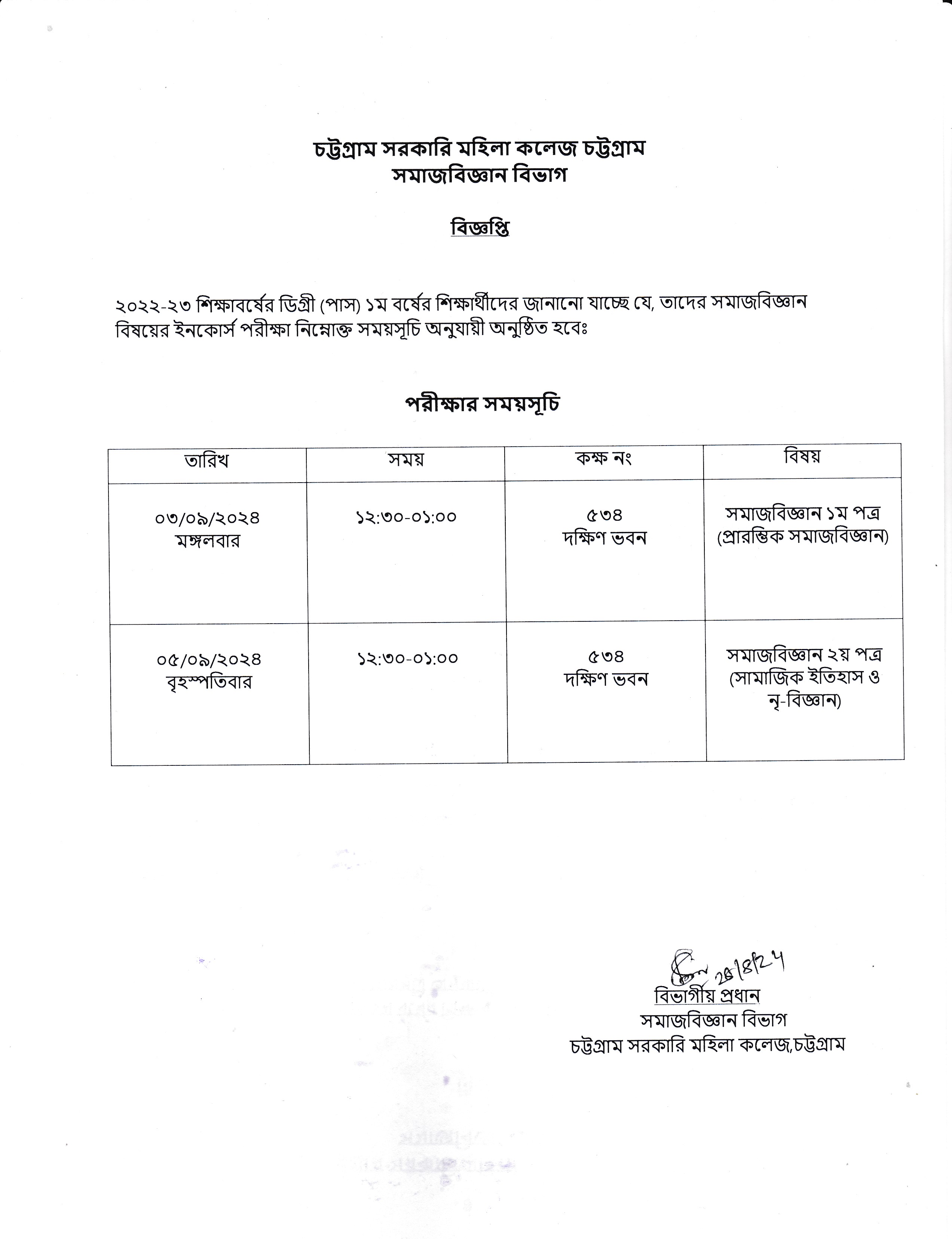 ২০২২-২০২৩ শিক্ষাবর্ষের ডিগ্রী (পাস) ১ম বর্ষের সমাজবিজ্ঞান বিষয়ের ইনকোর্স পরীক্ষার সময়সূচি প্রকাশ