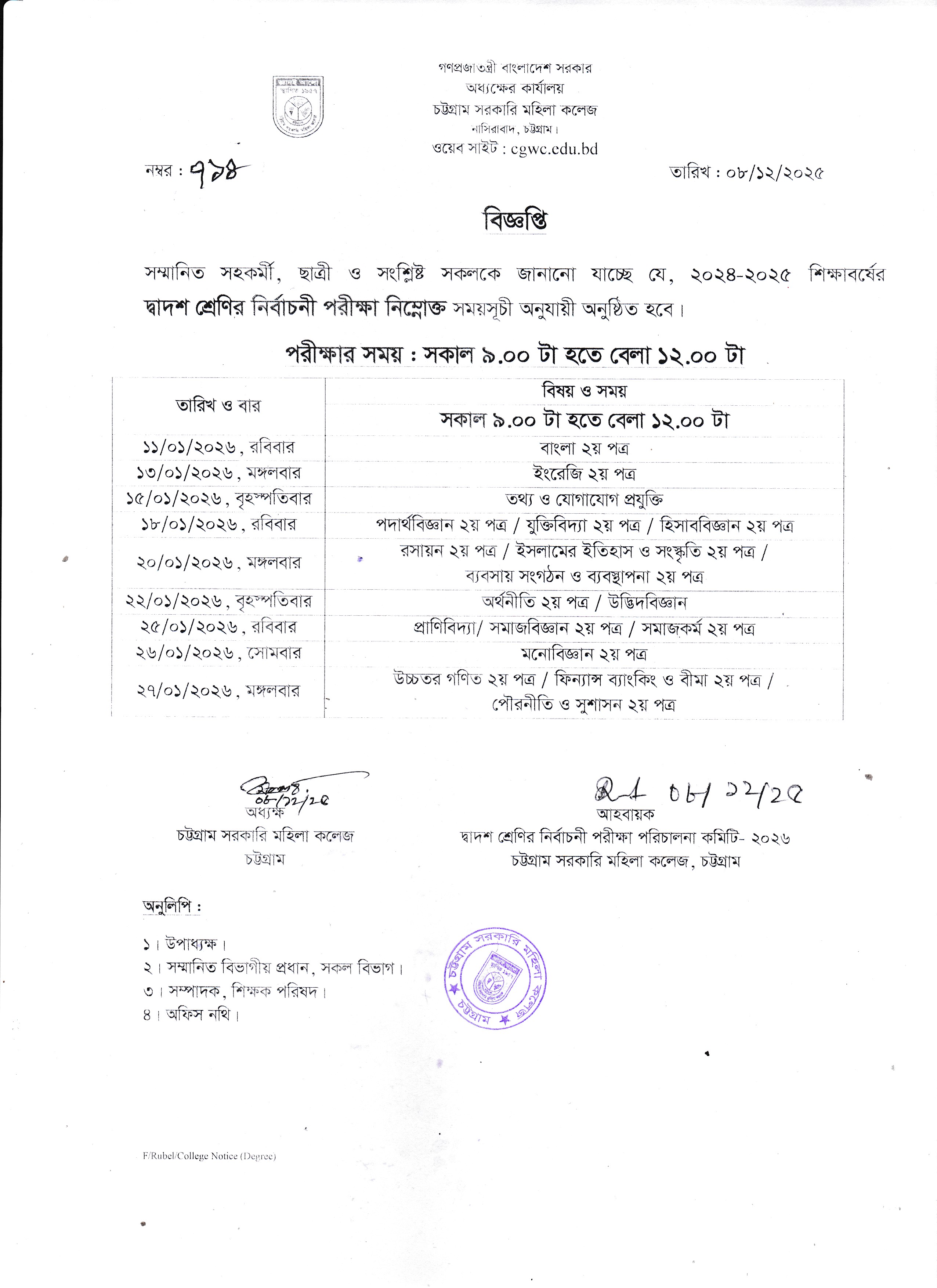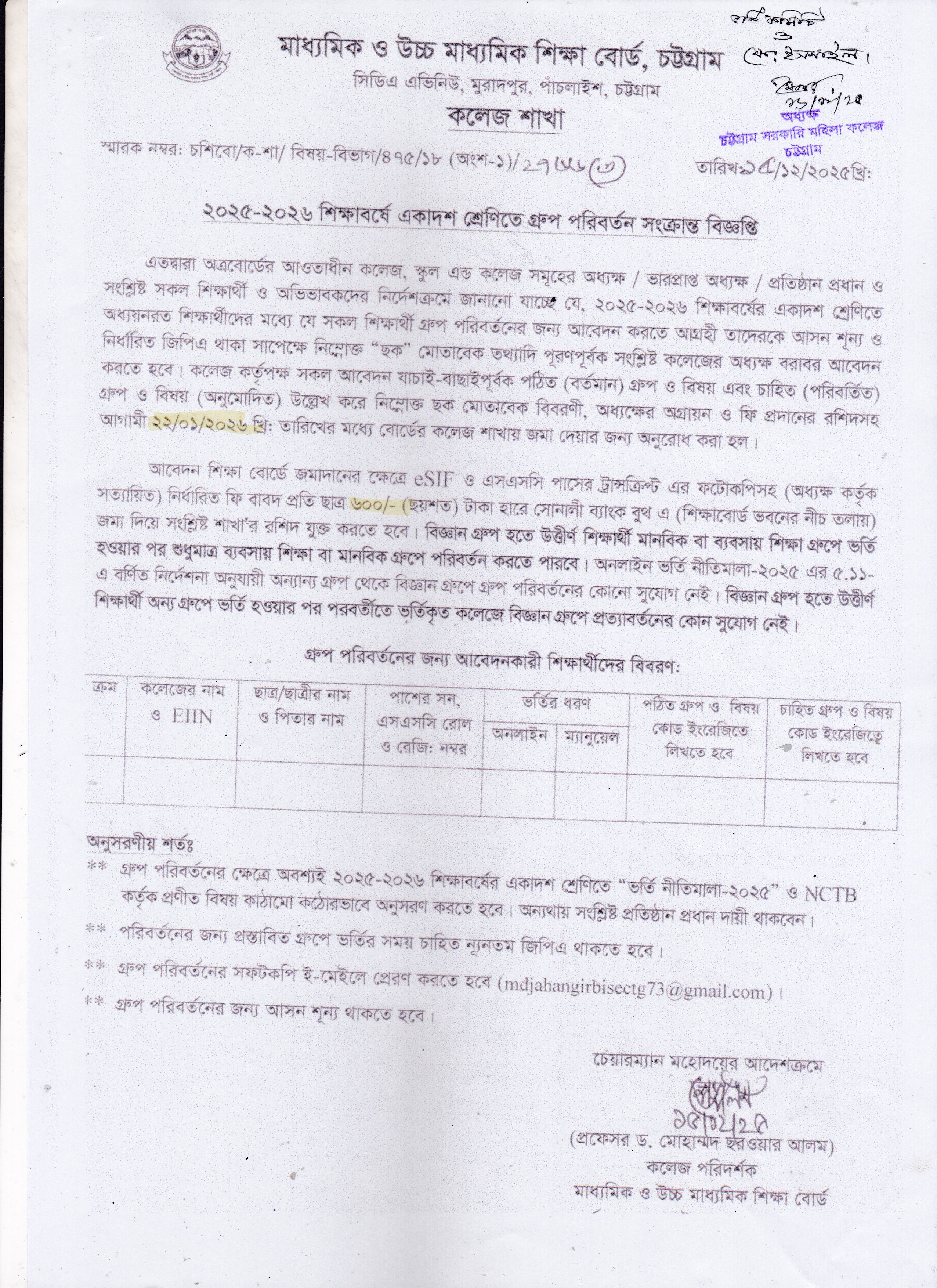 ২০২৫-২০২৬ শিক্ষাবর্ষে একাদশ শ্রেণিতে ছাত্রীদের বোর্ড পরিবর্তন সংক্রান্ত বিজ্ঞপ্তি।