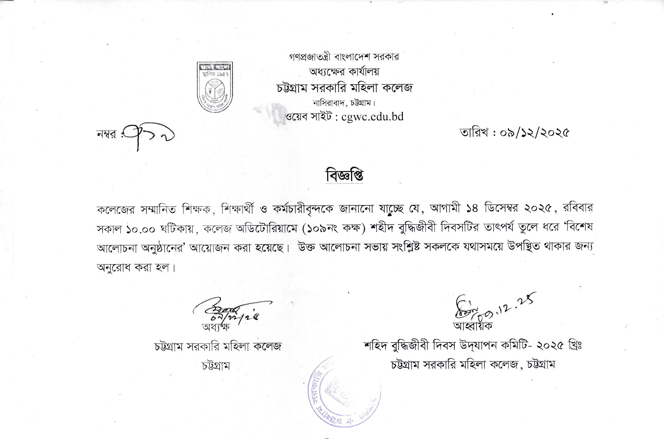 শহীদ বুদ্ধিজীবী দিবস-২০২৫ উদযাপন সংক্রান্ত বিজ্ঞপ্তি।