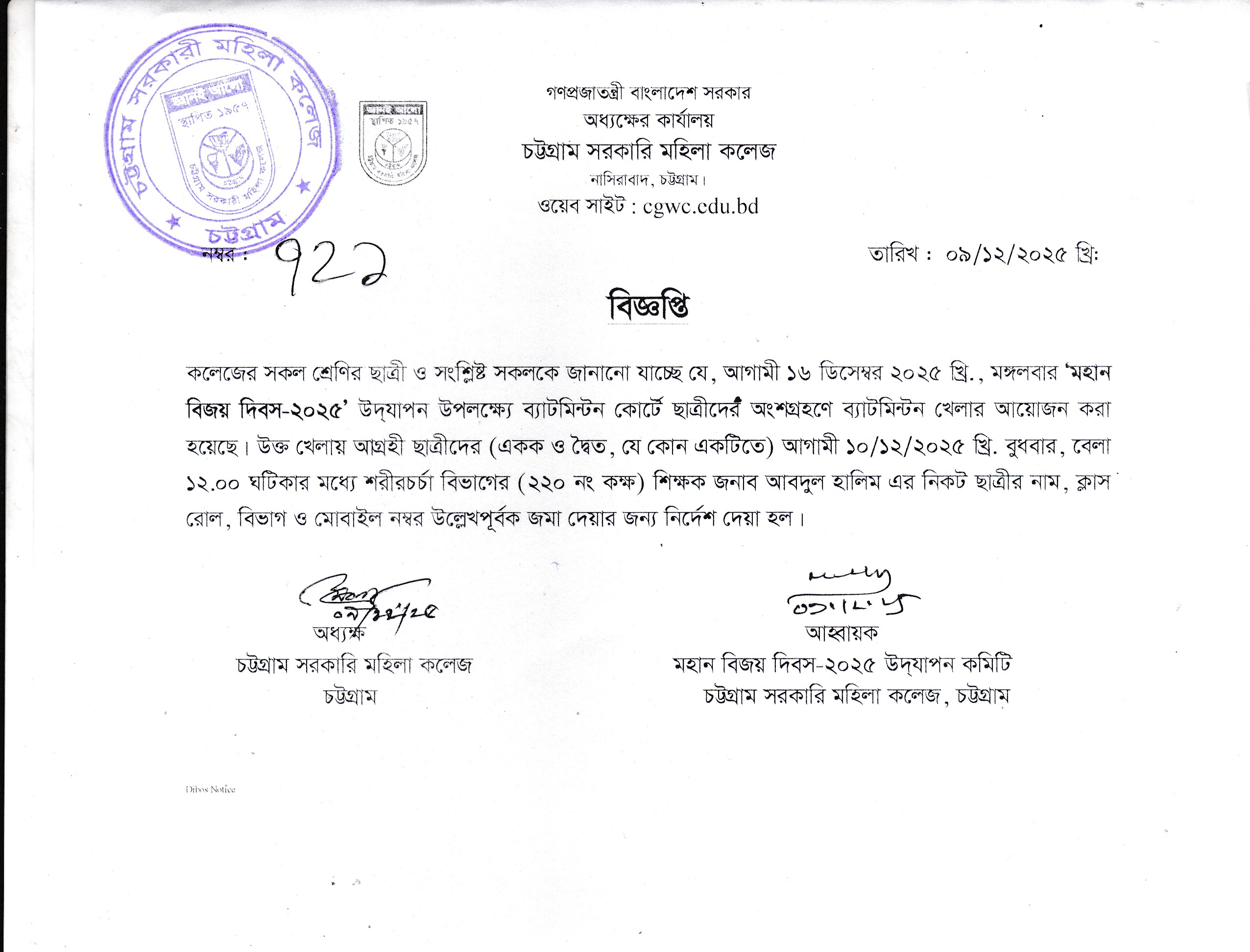 মহান বিজয় দিবস-২০২৫ উপলক্ষ্যে ব্যাটমিন্টন খেলার বিজ্ঞপ্তি।