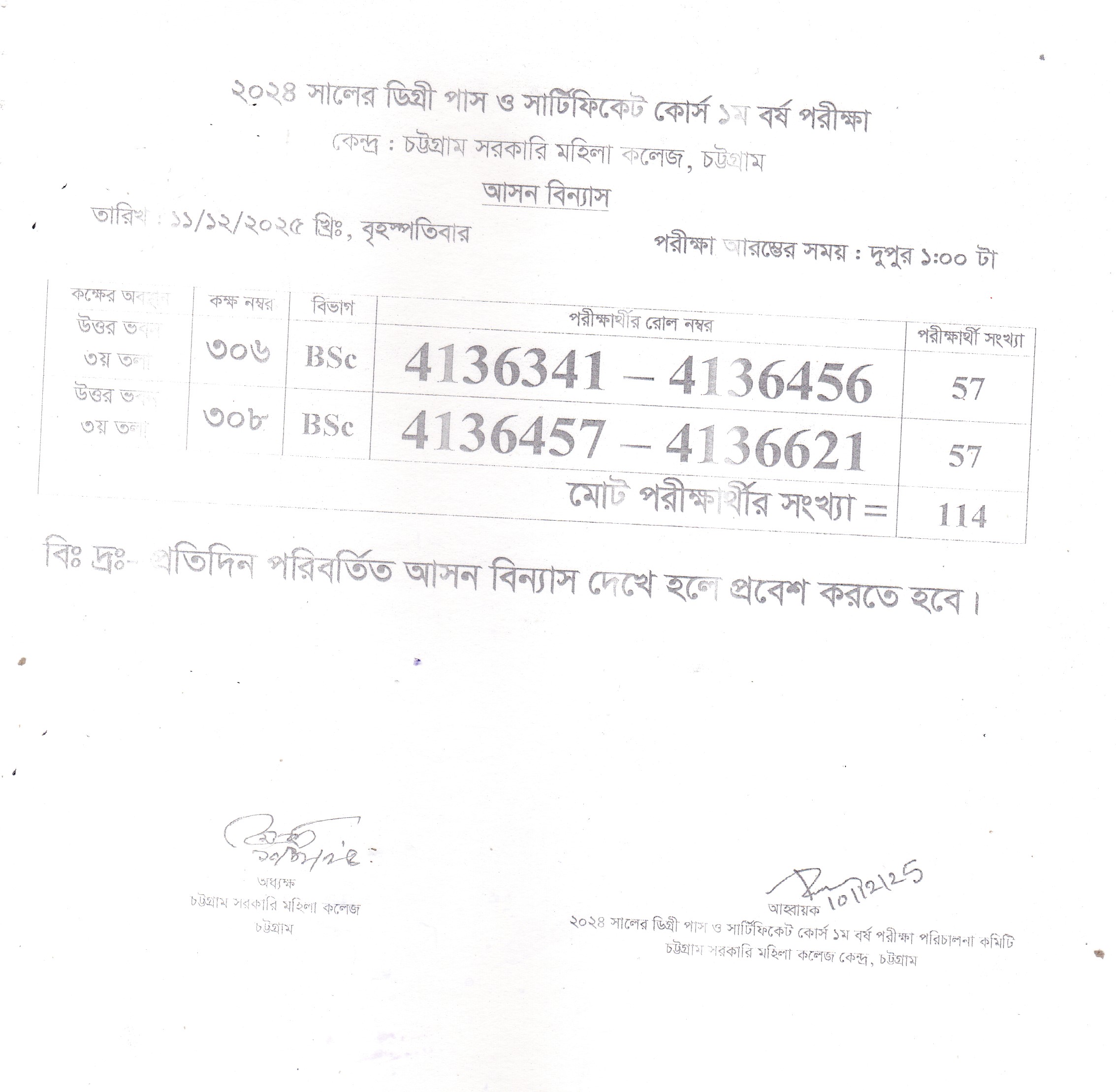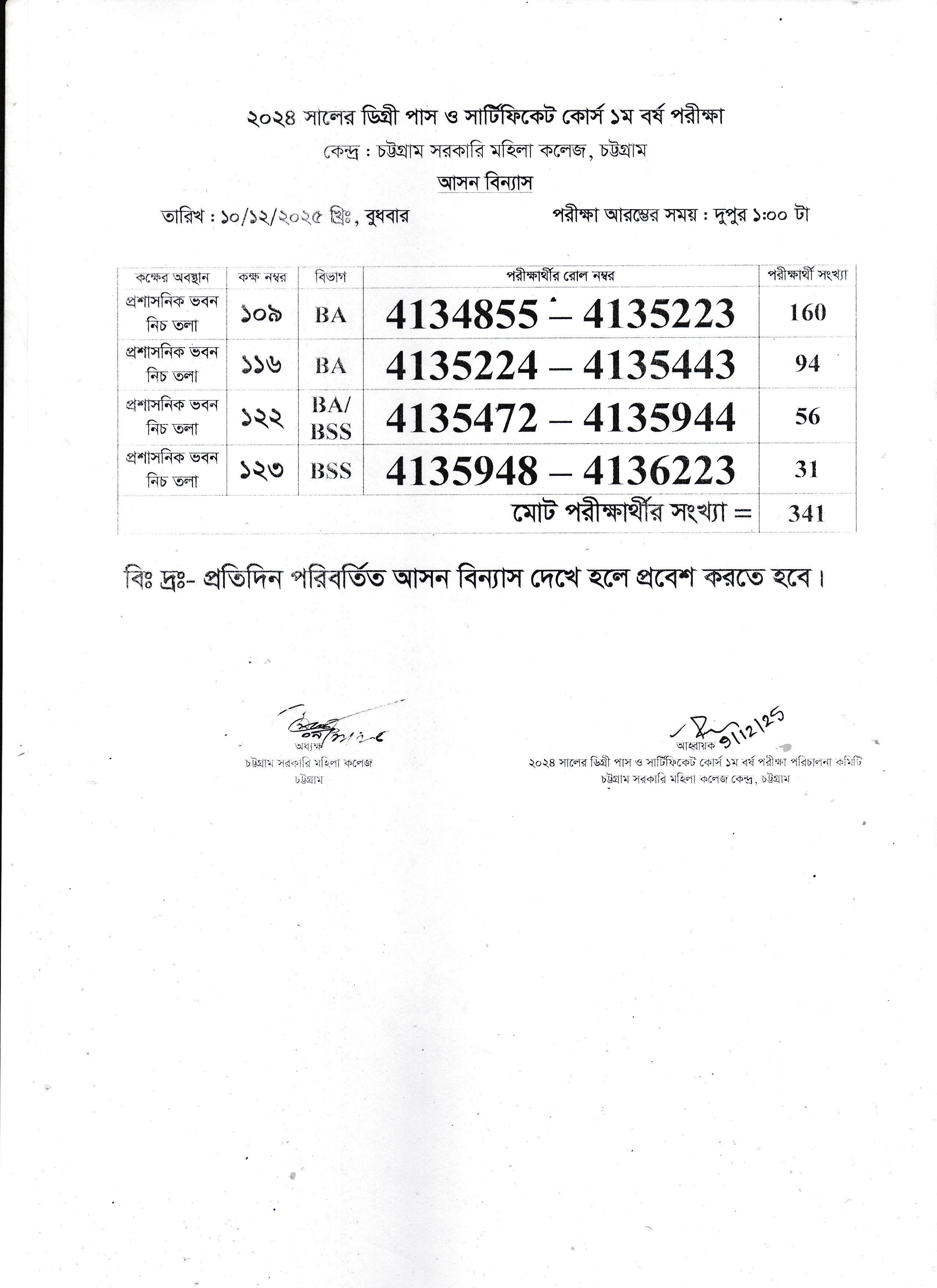 ২০২৪ সালের ডিগ্রী পাস ও সার্টিফিকেট কোর্স ১ম বর্ষ পরীক্ষার আগামী ১১/১২/২০২৫ খ্রি. এর আসন বিন্যাস