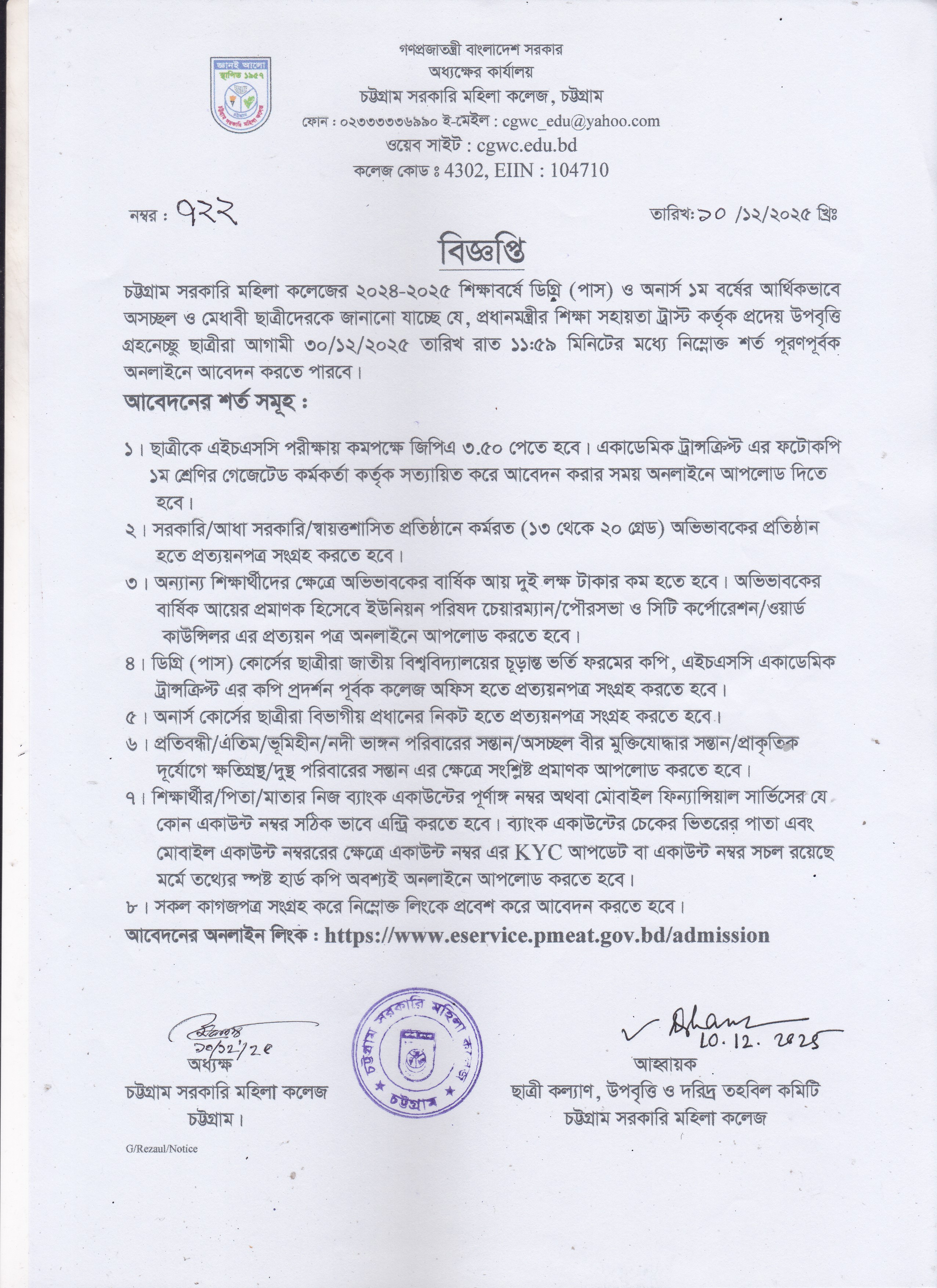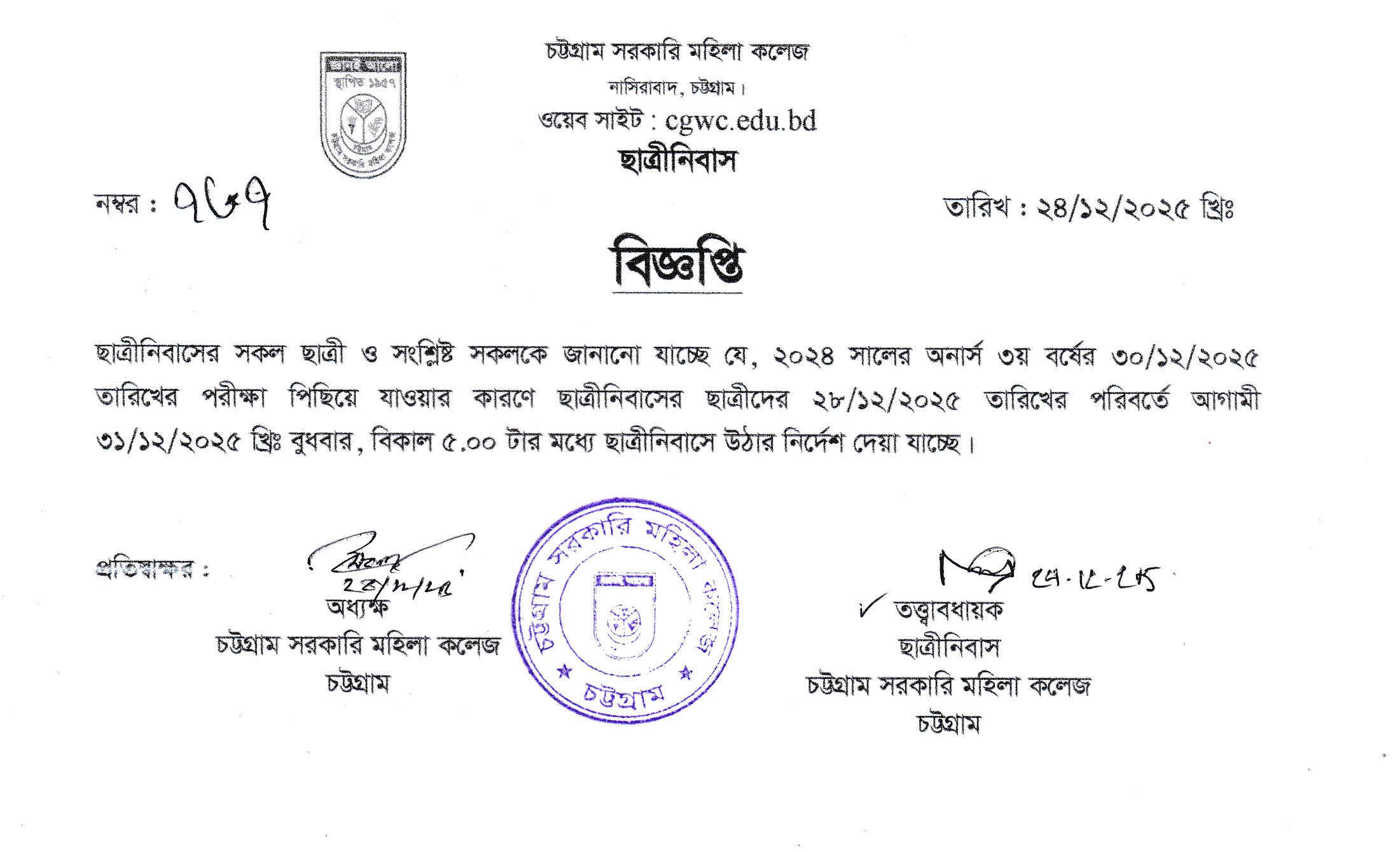 কলেজের ছাত্রীনিবাসের ছাত্রীদের উঠা সংক্রান্ত বিজ্ঞপ্তি