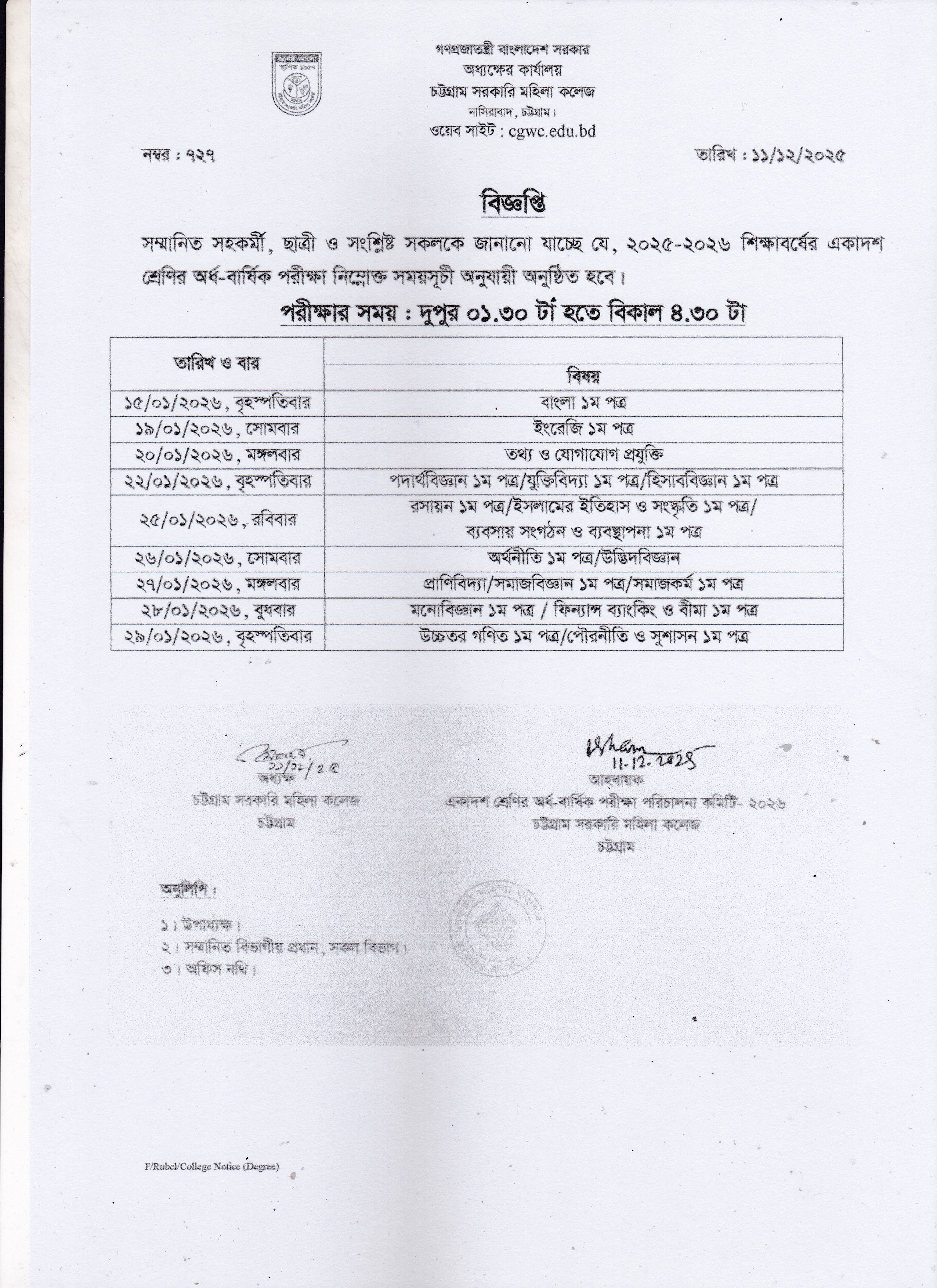 ২০২৫-২০২৬ শিক্ষাবর্ষে একাদশ শ্রেণির অর্ধ-বার্ষিক পরীক্ষার সময়সূচী।