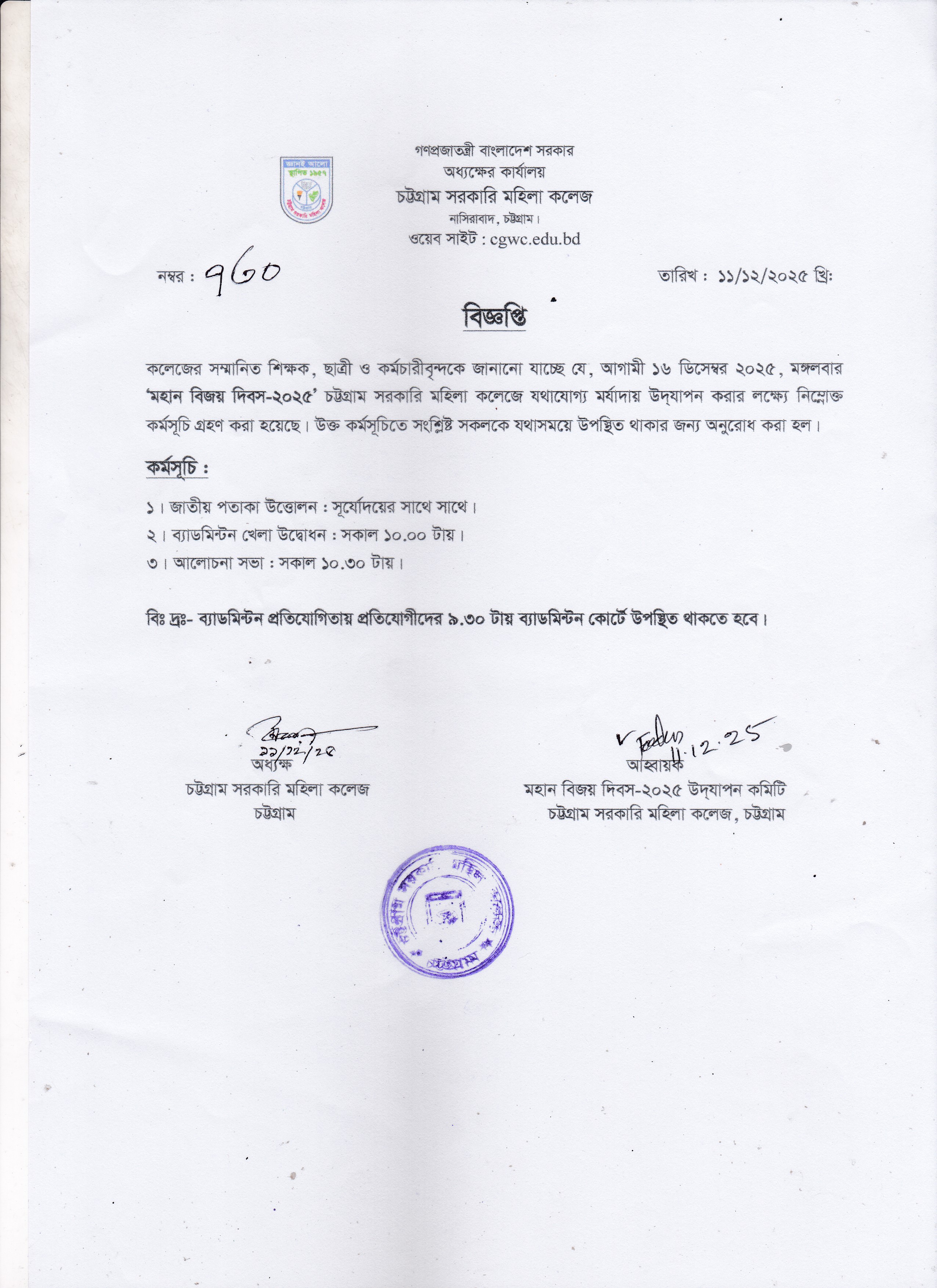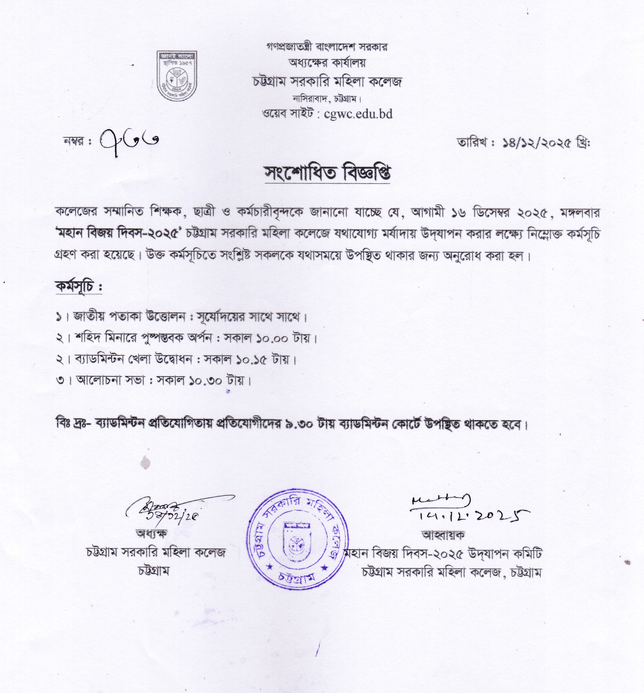 মহান বিজয় দিবস-২০২৫ উদযাপন সংক্রান্ত বিজ্ঞপ্তি।
