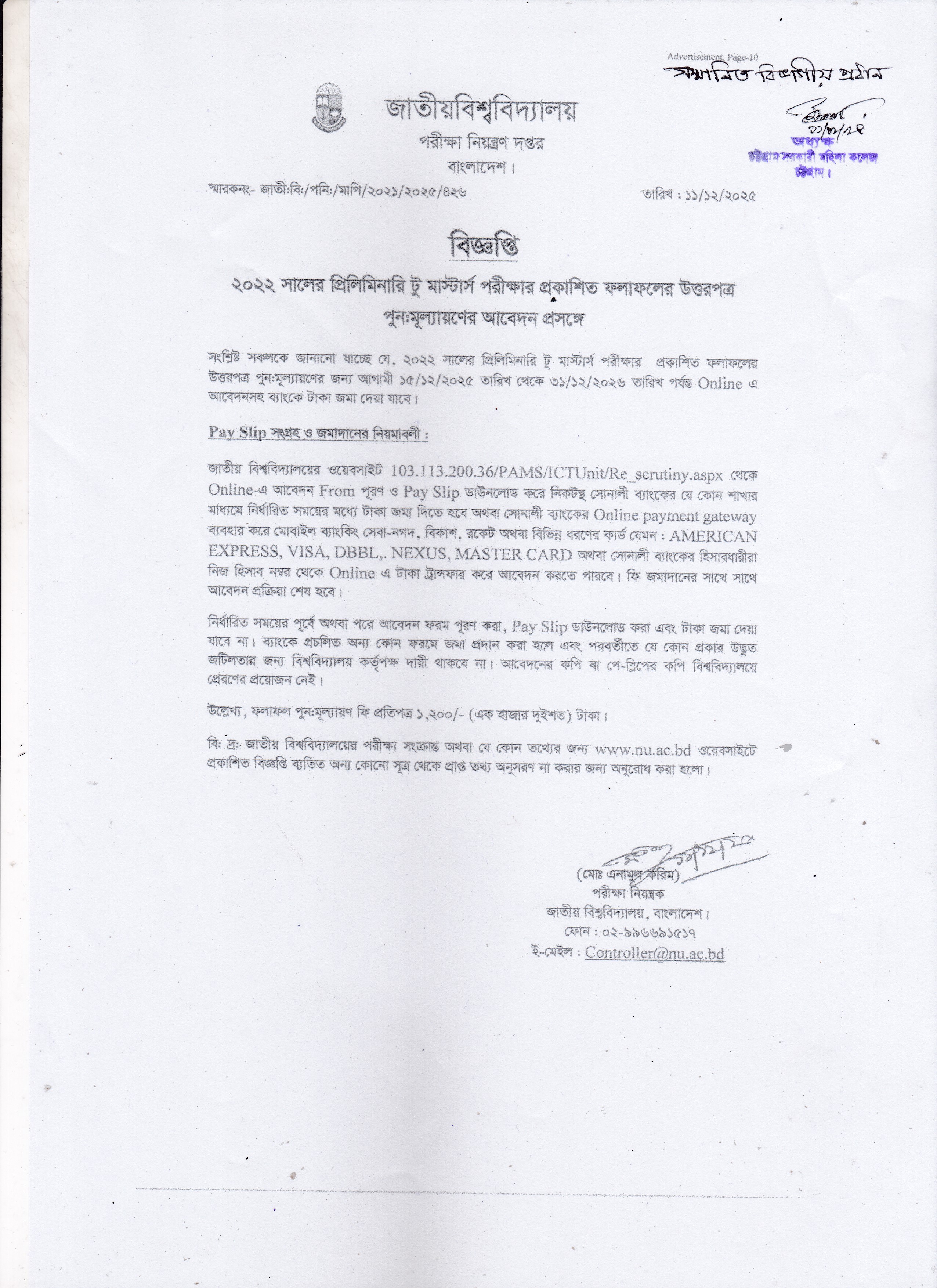 ২০২২ সালের প্রিলিমিনারি টু মাস্টার্স পরীক্ষার ফলাফর পুনঃনিরীক্ষনের বিজ্ঞপ্তি।