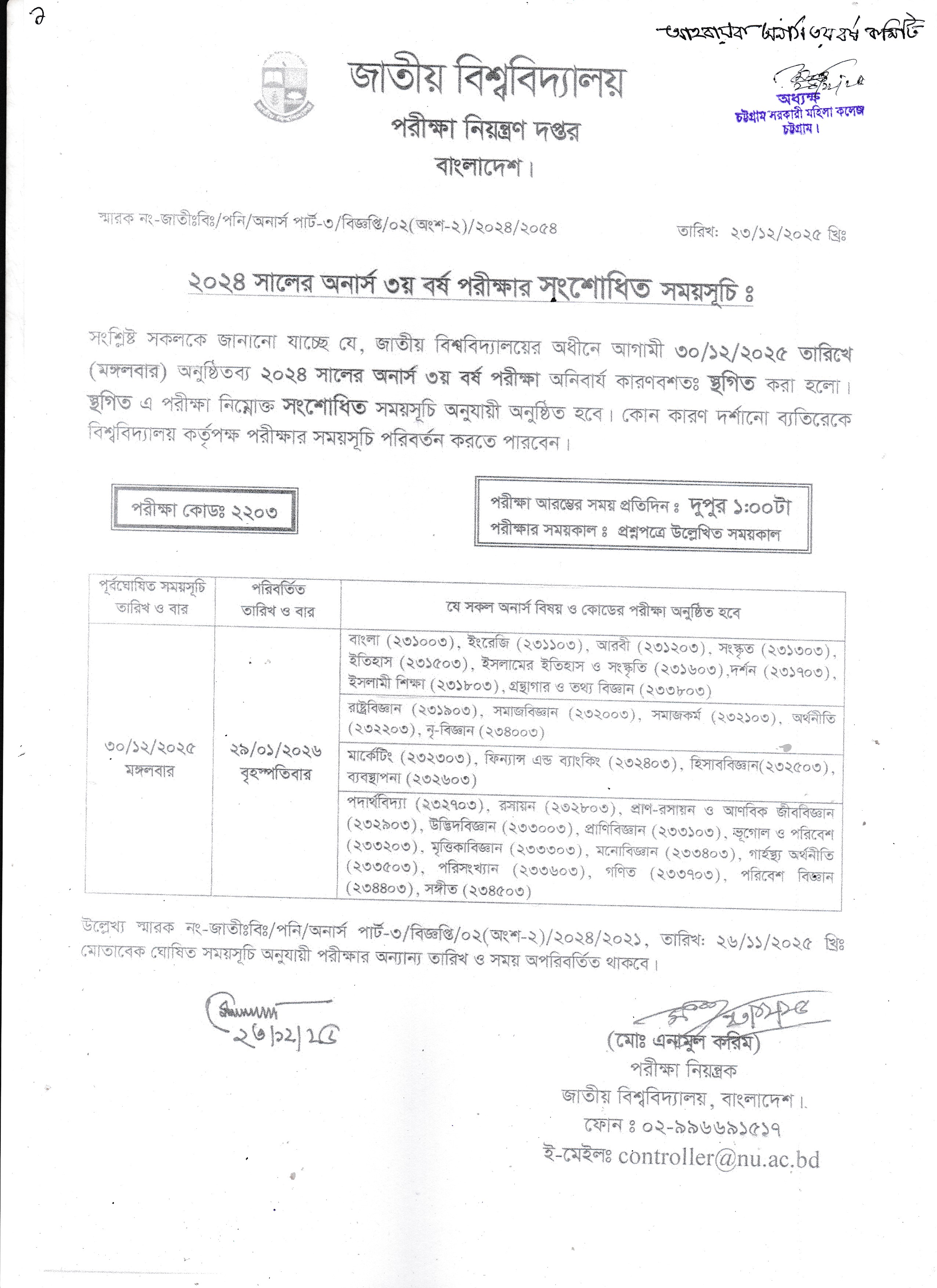 ২০২৪ সালের অনার্স ৩য় বর্ষের পরীক্ষার সংশোধিত সময়সূচি।