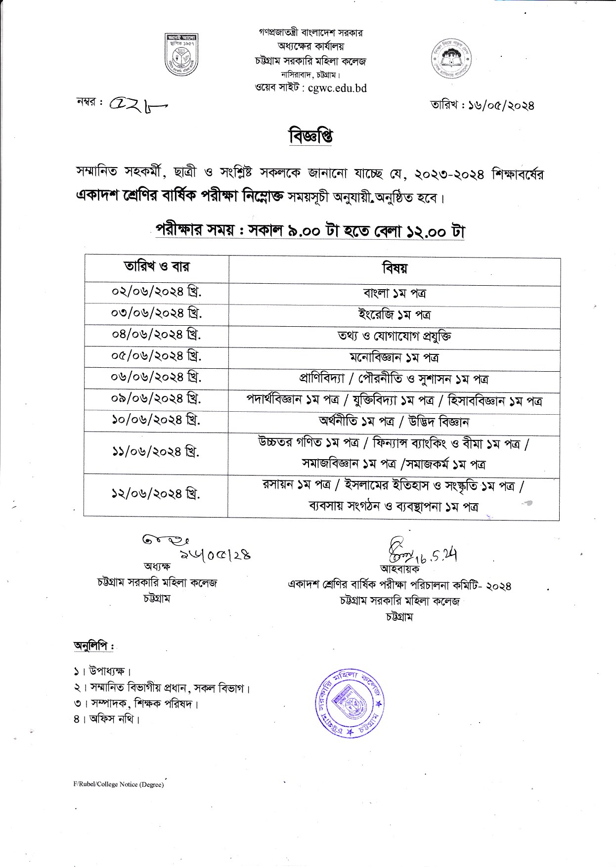 ২০২৩-২০২৪ শিক্ষাবর্ষে একাদশ শ্রেণির বার্ষিক পরীক্ষার সময়সূচি প্রকাশ (১৬/০৫/২০২৪)