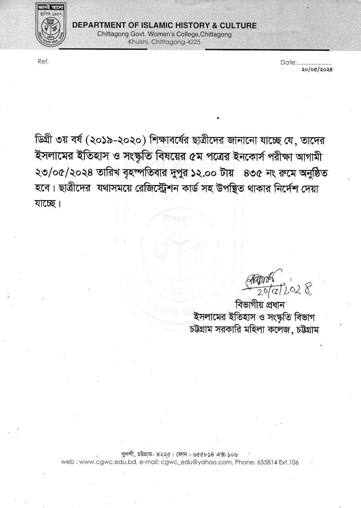 ২০১৯-২০২০ শিক্ষাবর্ষে ডিগ্রি (পাস) ৩য় বর্ষের ইসলামের ইতিহাস ওসংস্কৃতি বিষয়ের ইনকোর্স পরীক্ষার সময়সূচী প্রকাশ (20/05/2024)