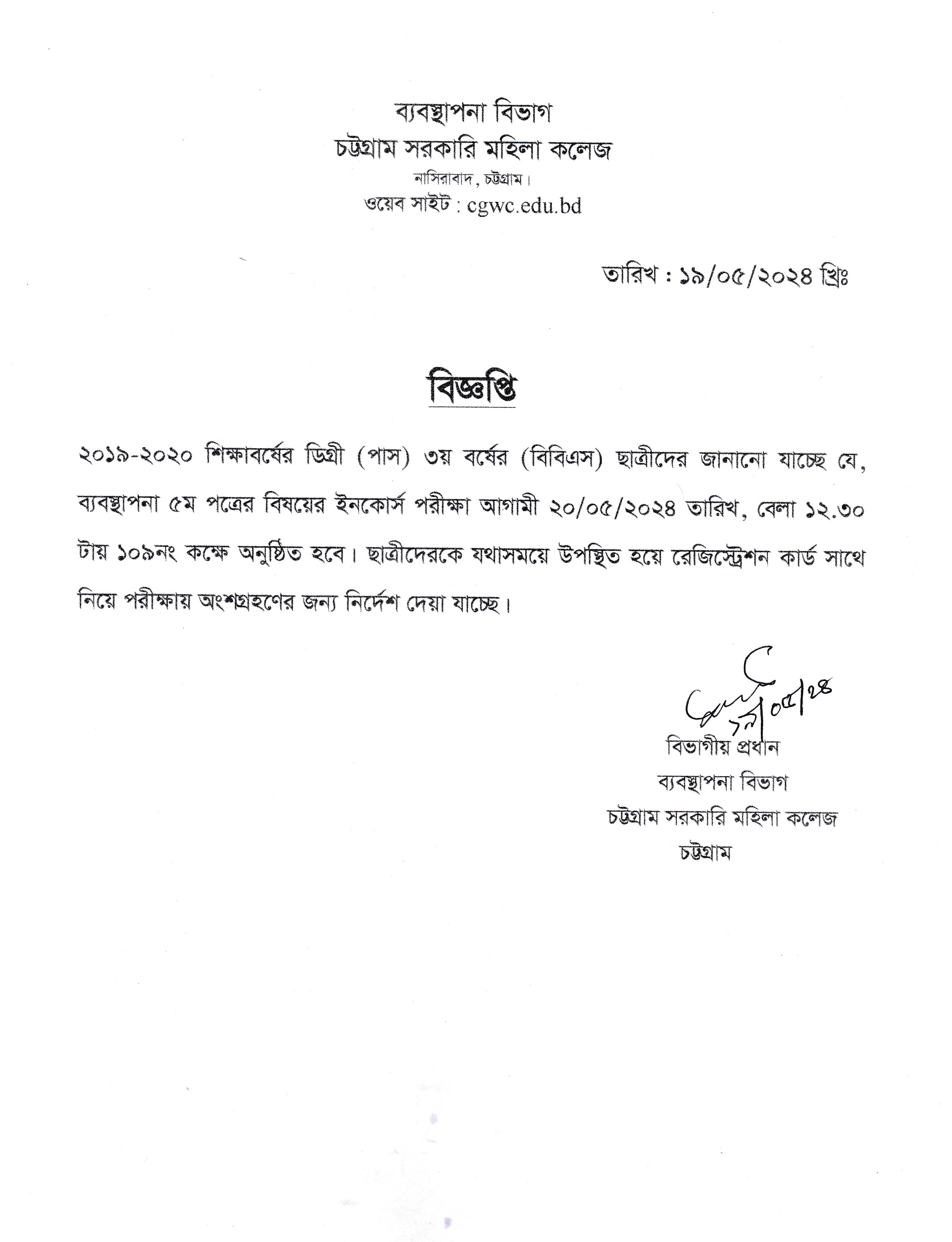 ২০১৯-২০২০ শিক্ষাবর্ষের ডিগ্রী (পাস) ৩য় বর্ষের ব্যবস্থাপনা বিষয়ের ইনকোর্স পরীক্ষার সময়সূচি