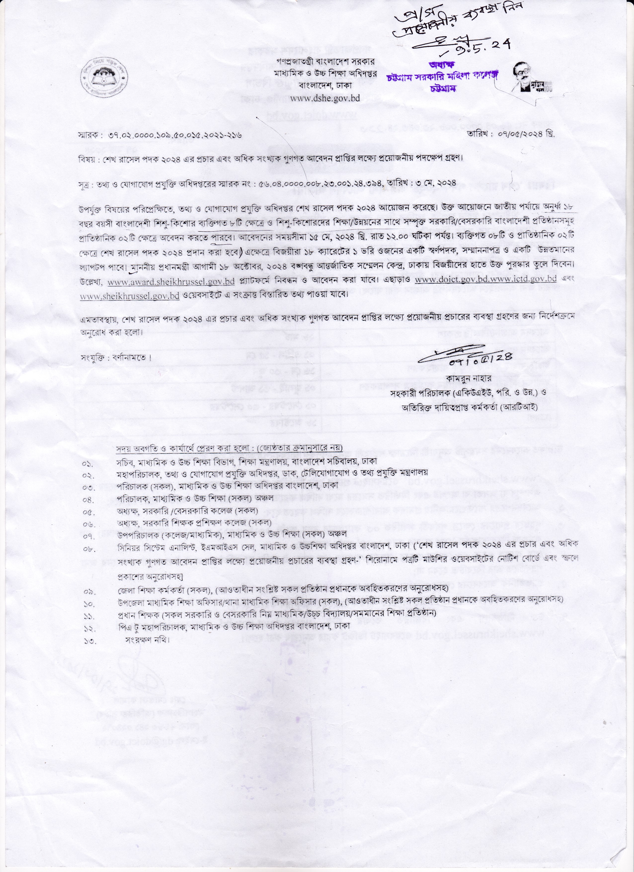 শেখ রাসেল পদক ২০২৪ এর প্রচার এবং অধিক সংখ্যক গুণগত আবেদন প্রাপ্তির লক্ষ্যে প্রয়োজনীয় পদক্ষেপ গ্রহণ সংক্রান্ত বিজ্ঞপ্তি
