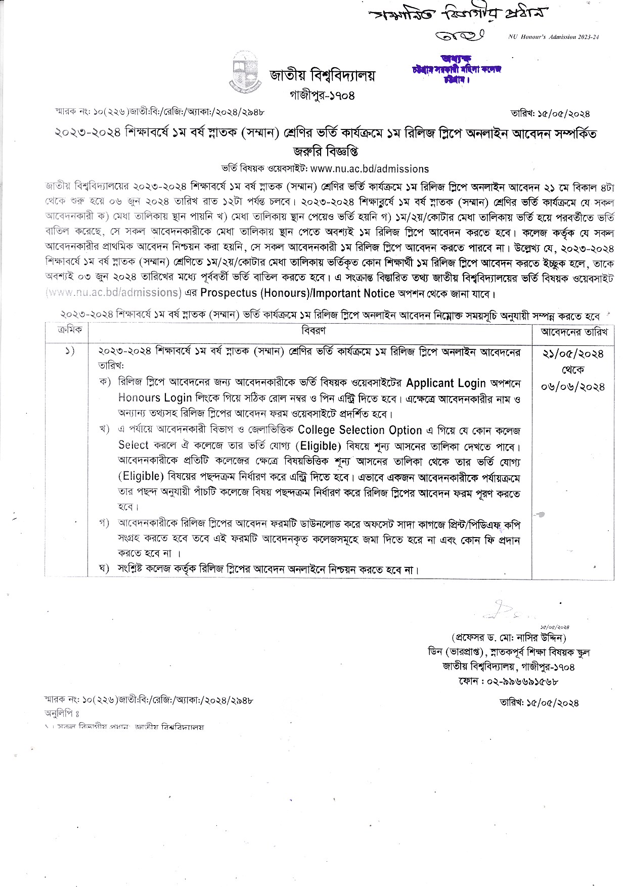 ২০২৩-২০২৪ শিক্ষাবর্ষে অনার্স ১ম বর্ষে ভর্তির জন্য ১ম রিলিজ স্লিপের আবেদন সংক্রান্ত বিজ্ঞপ্তি (১৯/০৫/২০২৪)