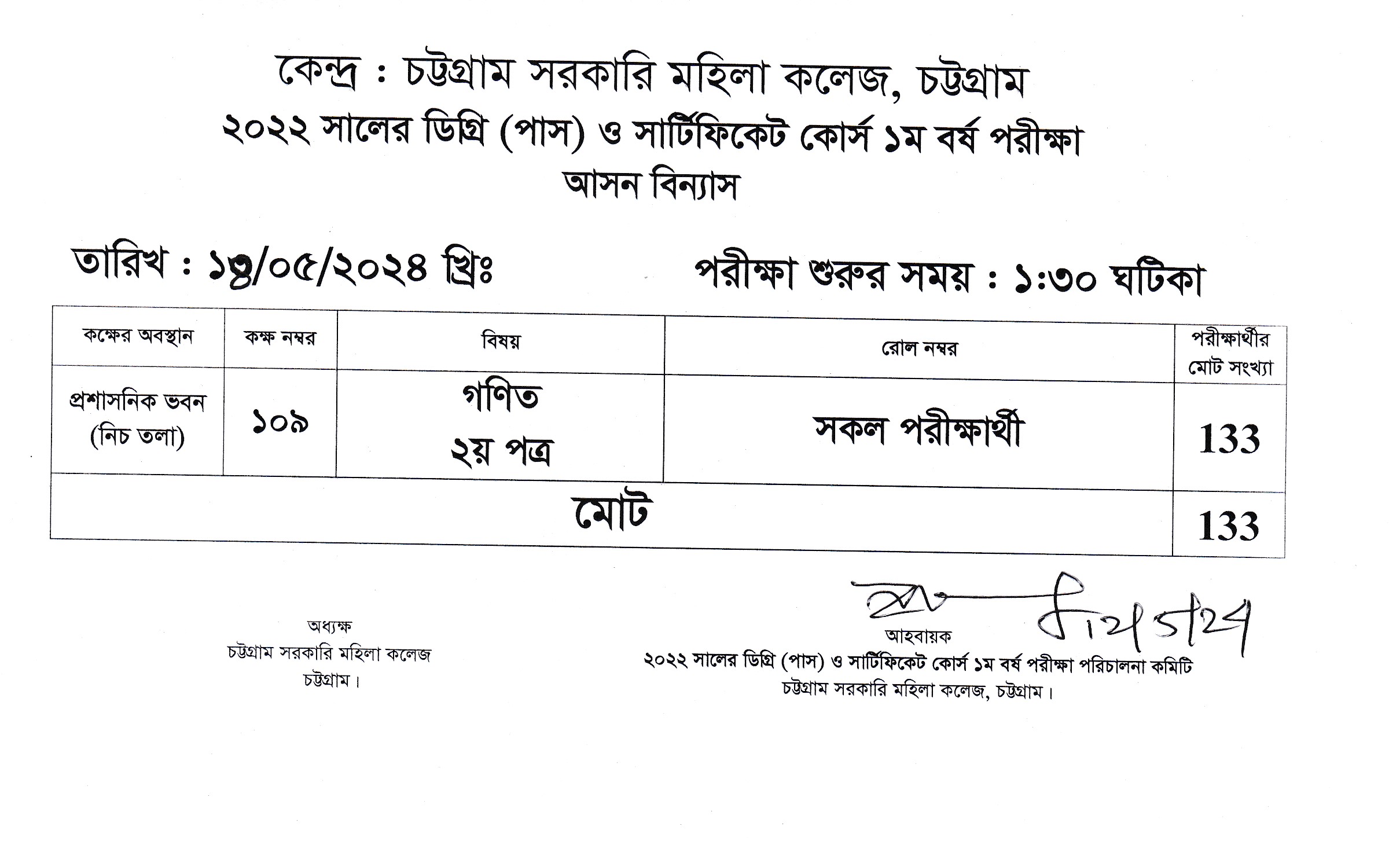 আগামী ১৪/০৫/২০২৪ তারিখের ২০২২ সালের ডিগ্রী (পাস) ১ম বর্ষ চূড়ান্ত পরীক্ষার আসন বিন্যাস