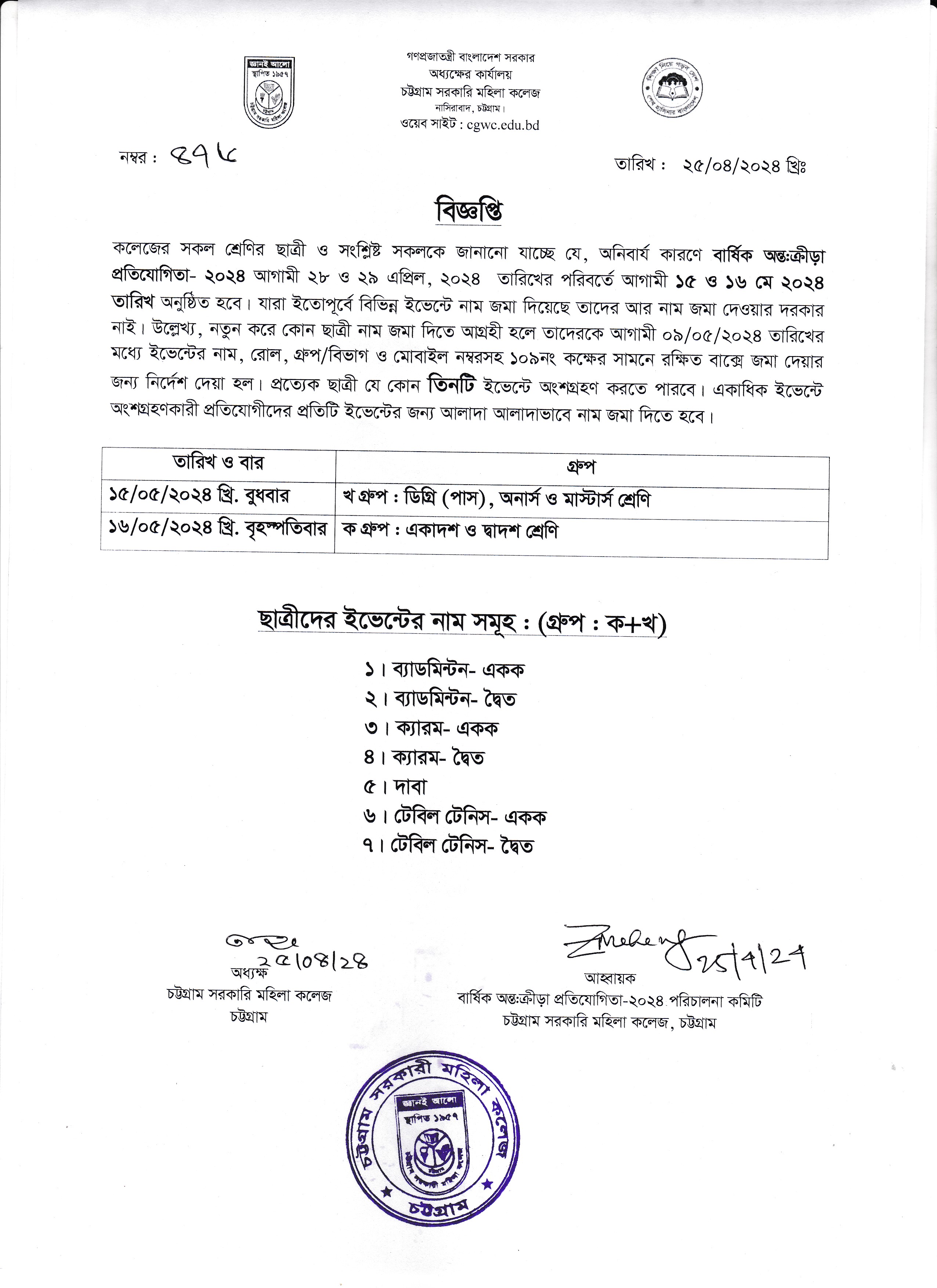 কলেজে বার্ষিক অন্তঃক্রীড়া প্রতিযোগিতা-২০২৪ এর সময়সূচি পরিবর্তন প্রসঙ্গে।