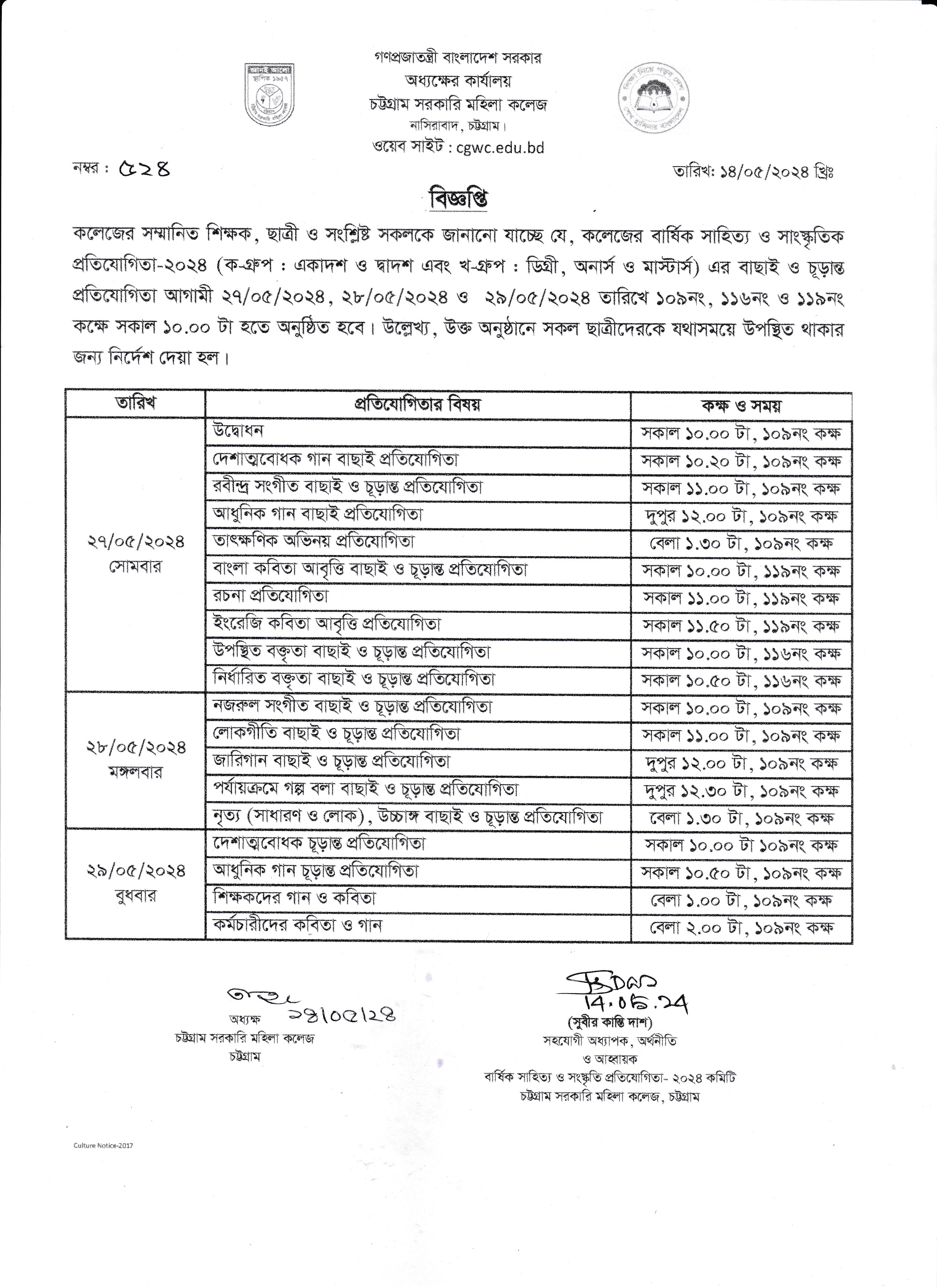 কলেজের বার্ষিক সাহিত্য ও সাংস্কৃতিক প্রতিযোগিতা-২০২৪ এর বাছাই ও চূড়ান্ত প্রতিযোগিতার সময়সূচি প্রকাশ