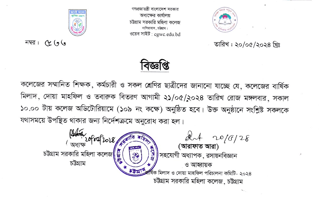 বার্ষিক মিলাদ মাহফিল-২০২৪ সংক্রান্ত বিজ্ঞপ্তি (২০/০৫/২০২৪)