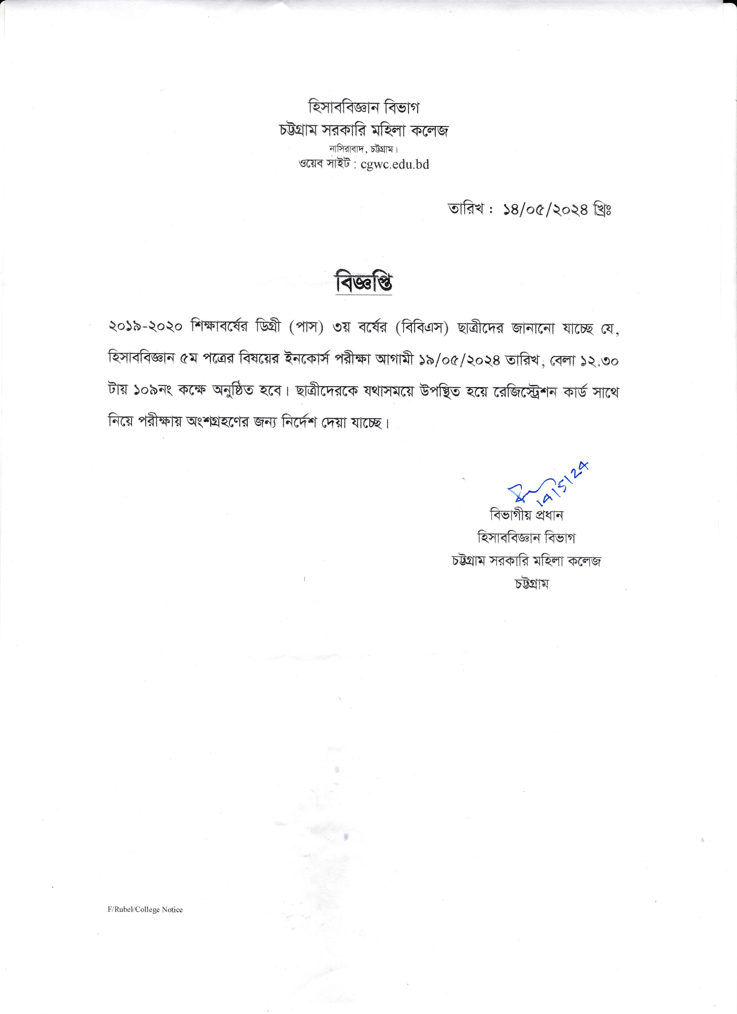 ২০১৯-২০২০ শিক্ষাবর্ষের ডিগ্রী (পাস) ৩য় বর্ষের হিসাববিজ্ঞান বিষয়ের ইনকোর্স পরীক্ষার আসন বিন্যাস