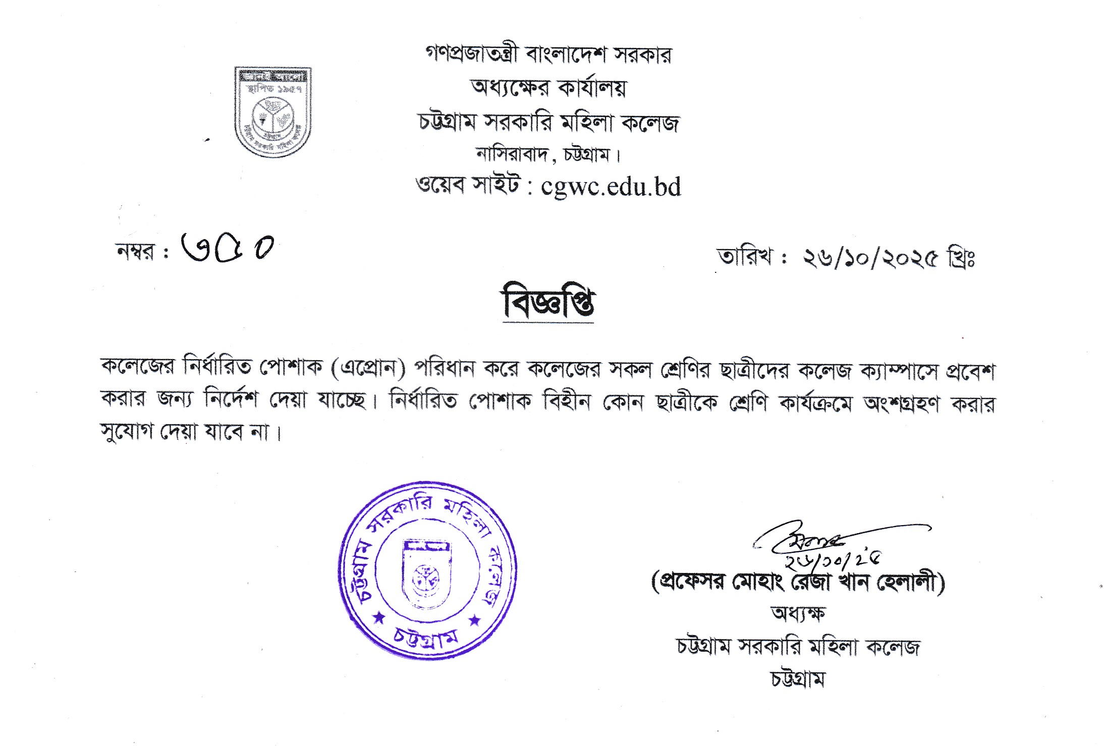 কলেজের নির্ধারিত পোশাক (এপ্রোন) পরিধান সংক্রান্ত বিজ্ঞপ্তি