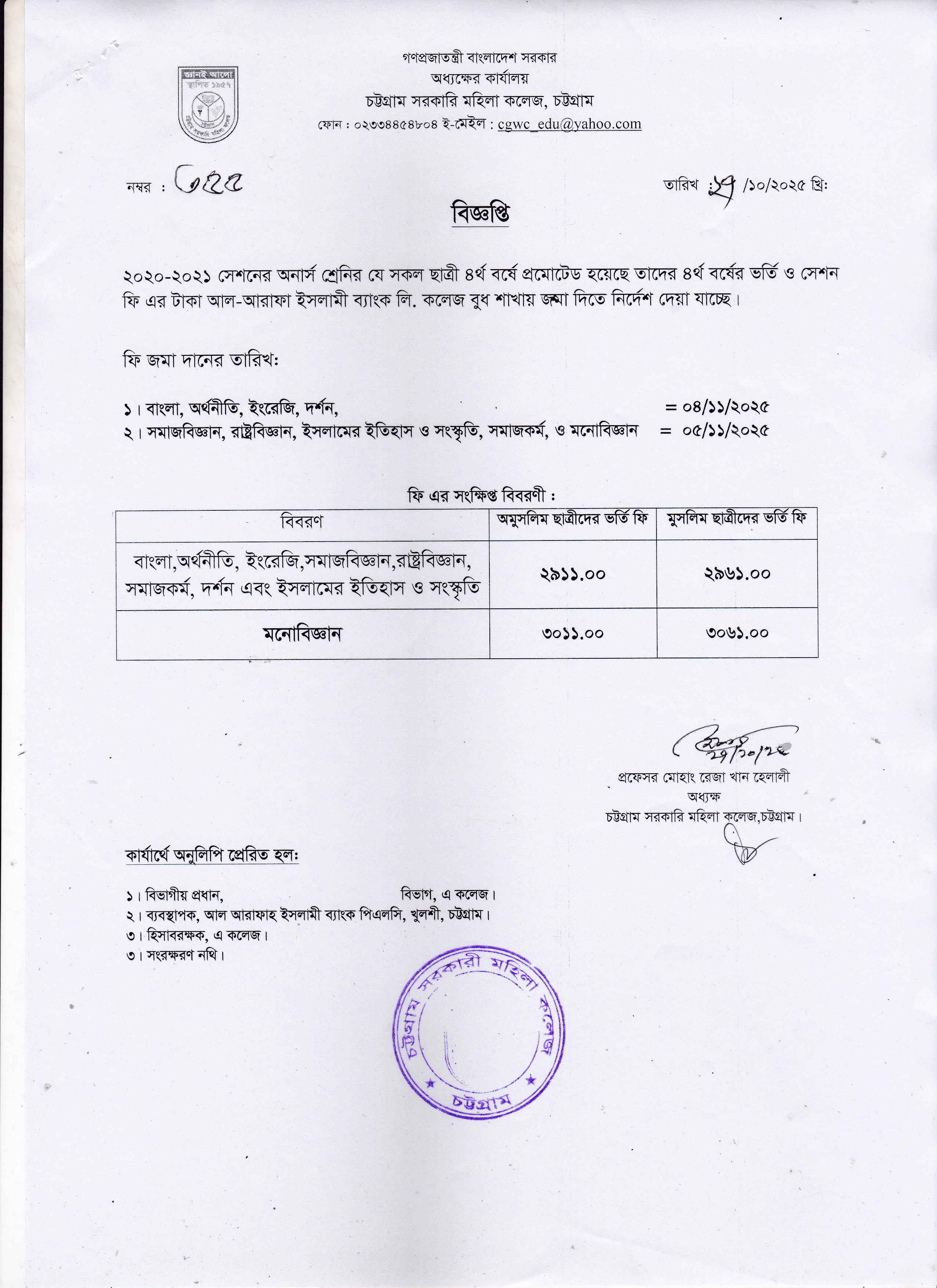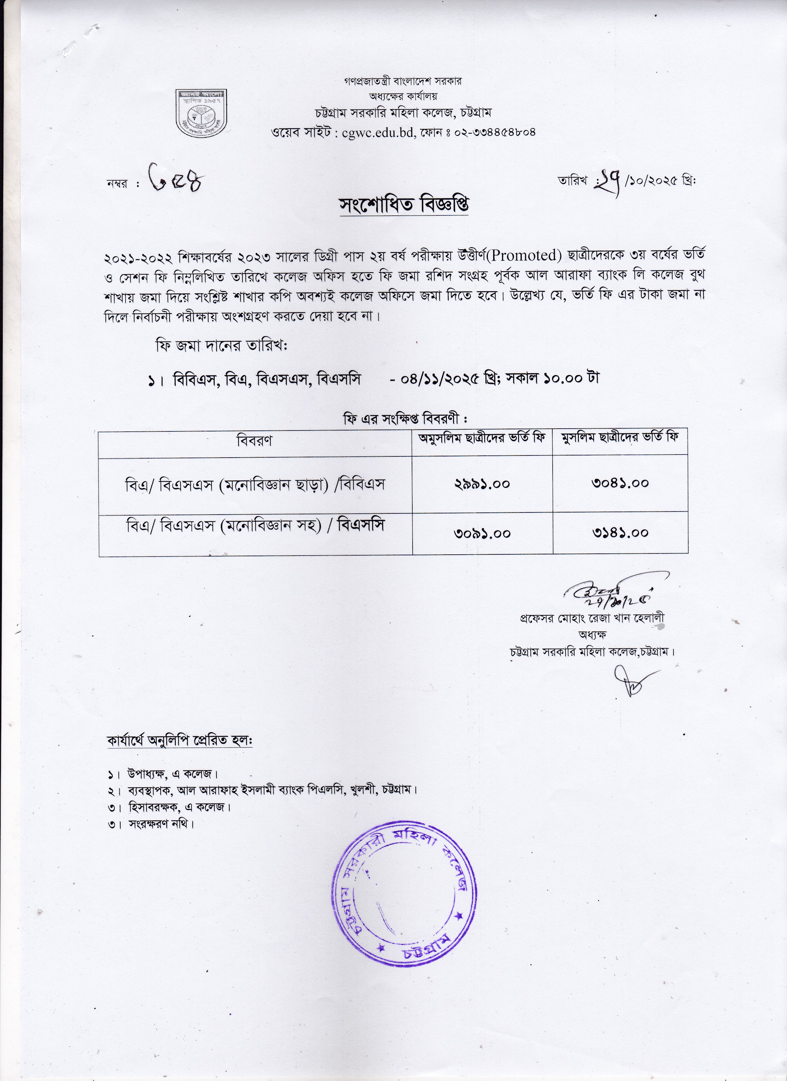 ২০২০-২০২১ শিক্ষাবর্ষে অনার্স ৩য় বর্ষের ছাত্রীদের ৪র্থ বর্ষের ভর্তি ও সেশন ফি জমাদান সংক্রান্ত বিজ্ঞপ্তি।