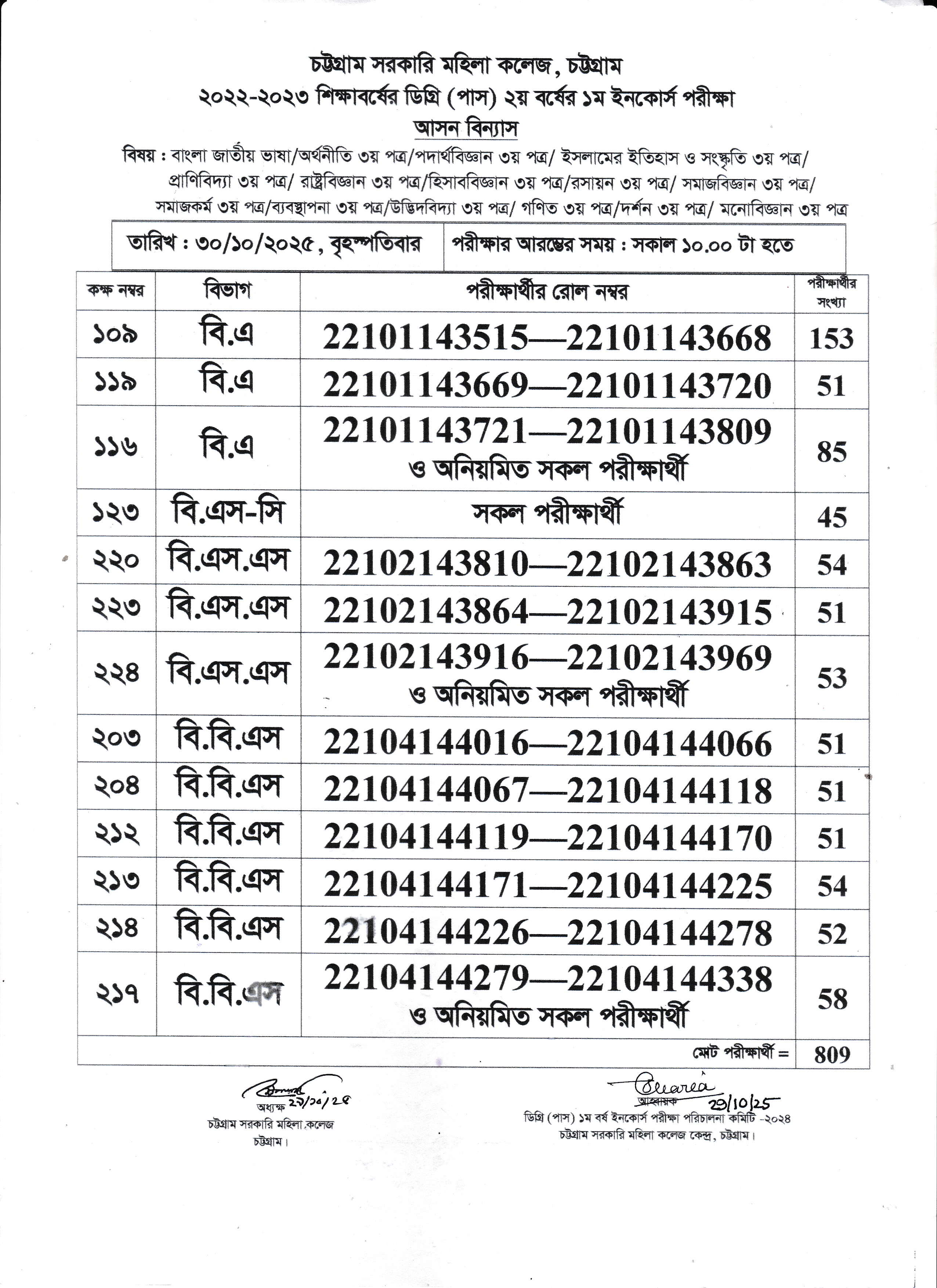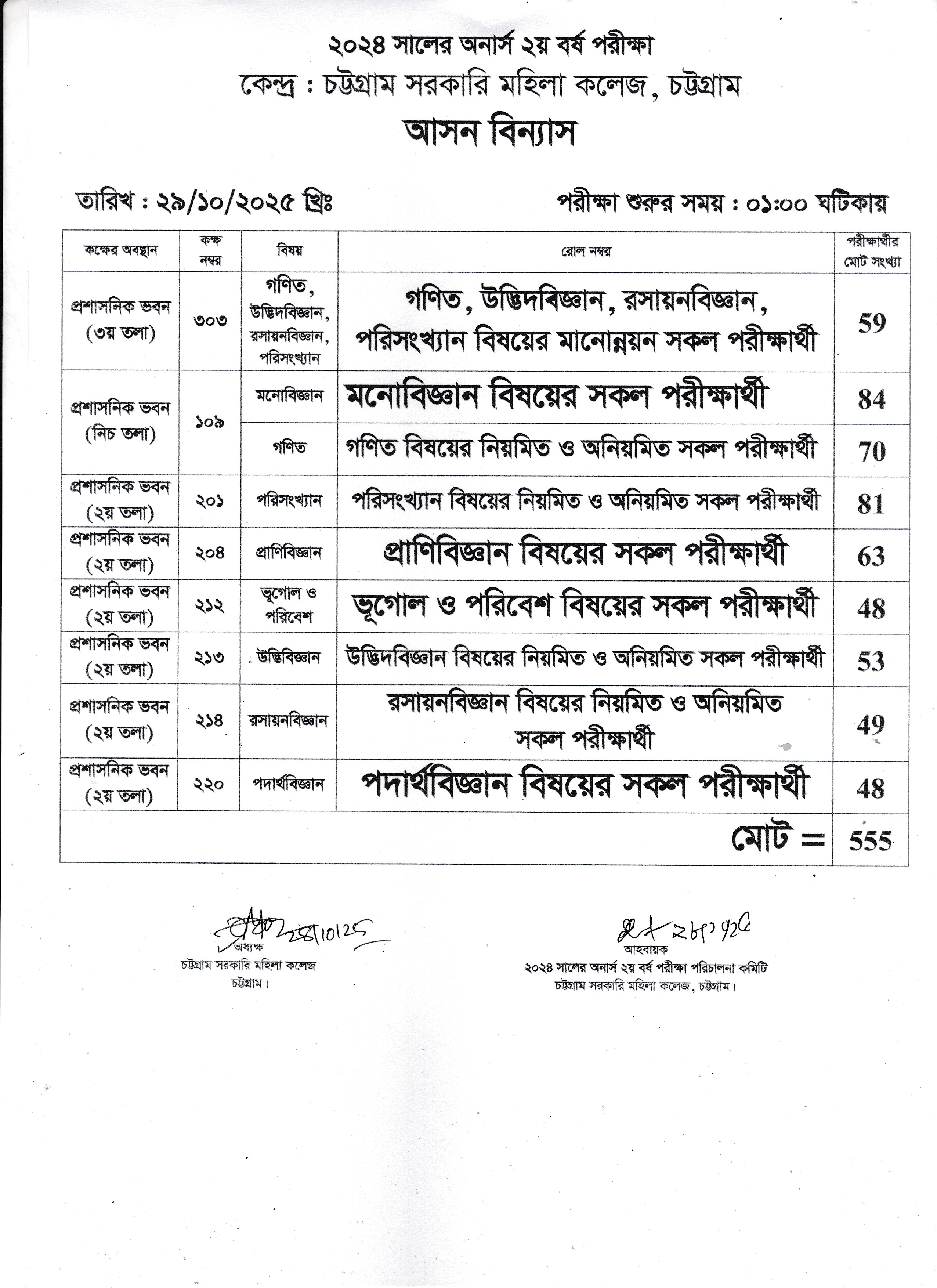 ২০২৪ সালের অনার্স ২য় বর্ষ পরীক্ষার ২৯/১০/২০২৫ তারিখের আসন বিন্যাস।