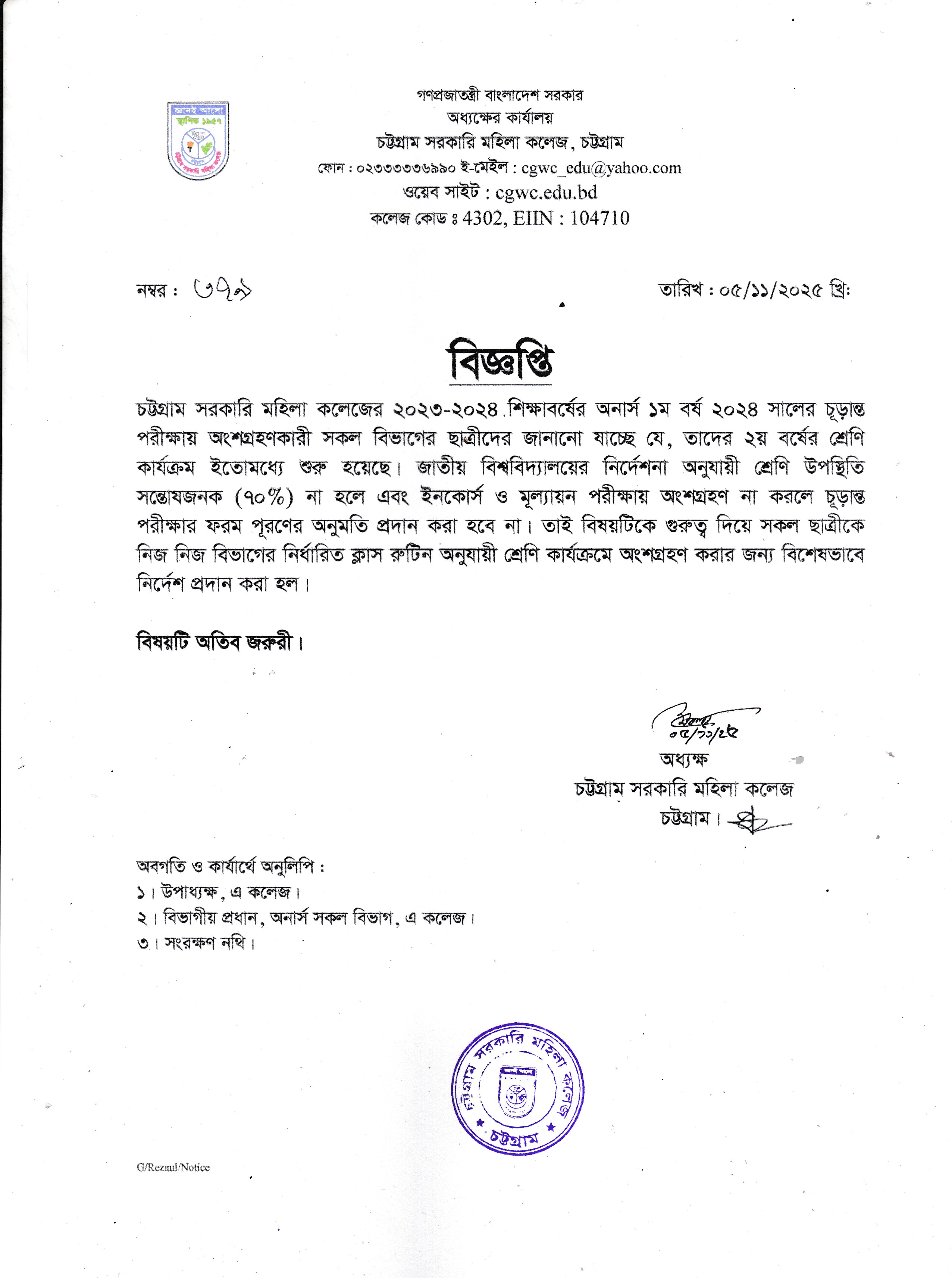 ২০২৪ সালের অনার্স ১ম বর্ষের চূড়ান্ত পরীক্ষায় অংশগ্রহণকারী ছাত্রীদের অনার্স ২য় বর্ষের শ্রেণি কার্যক্রম সংক্রান্ত বিজ্ঞপ্তি।