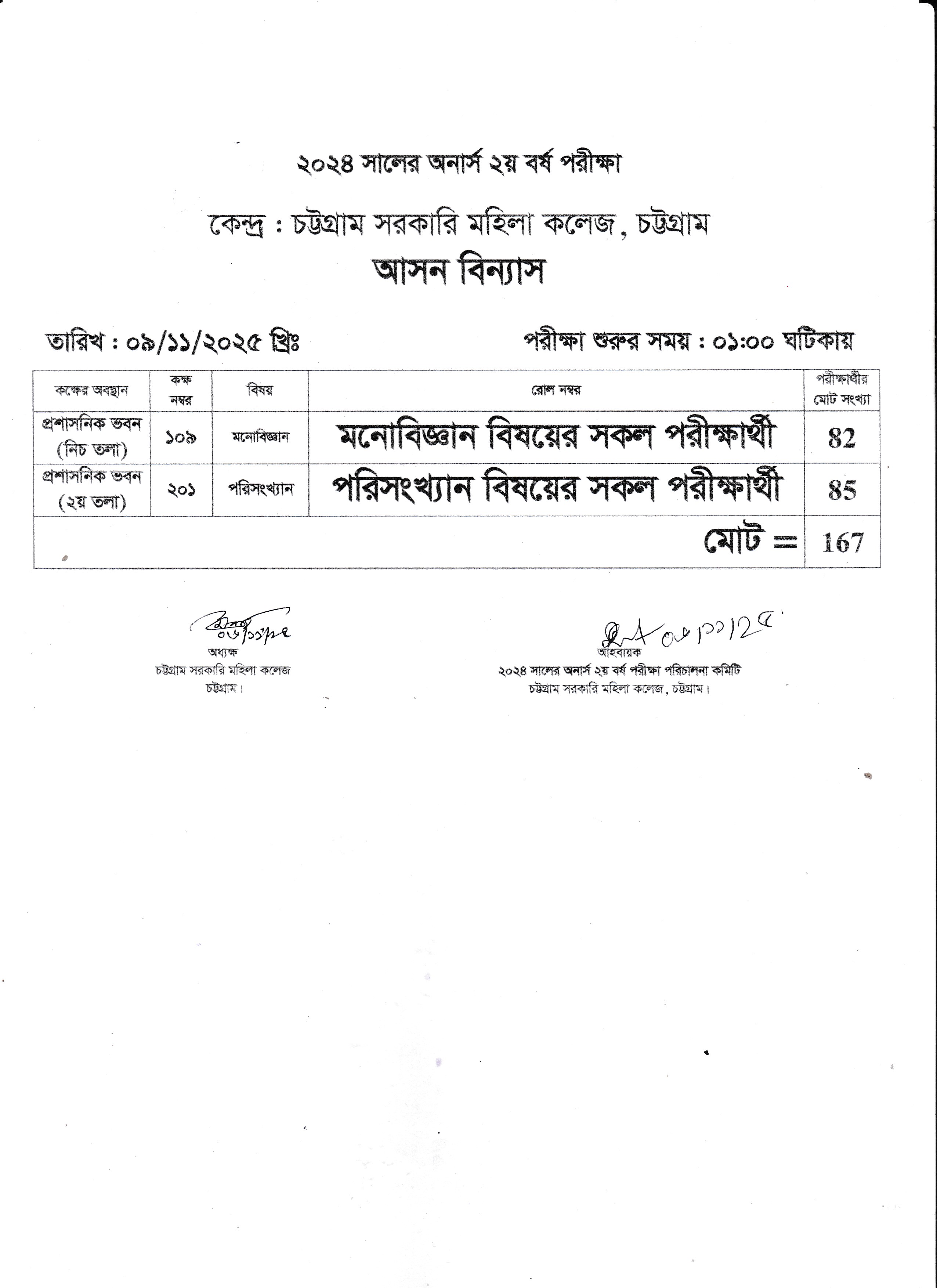 ২০২৪ সালের অনার্স ২য় বর্ষ পরীক্ষার আগামী ০৯/১১/২০২৫ খ্রি. আসন বিন্যাস