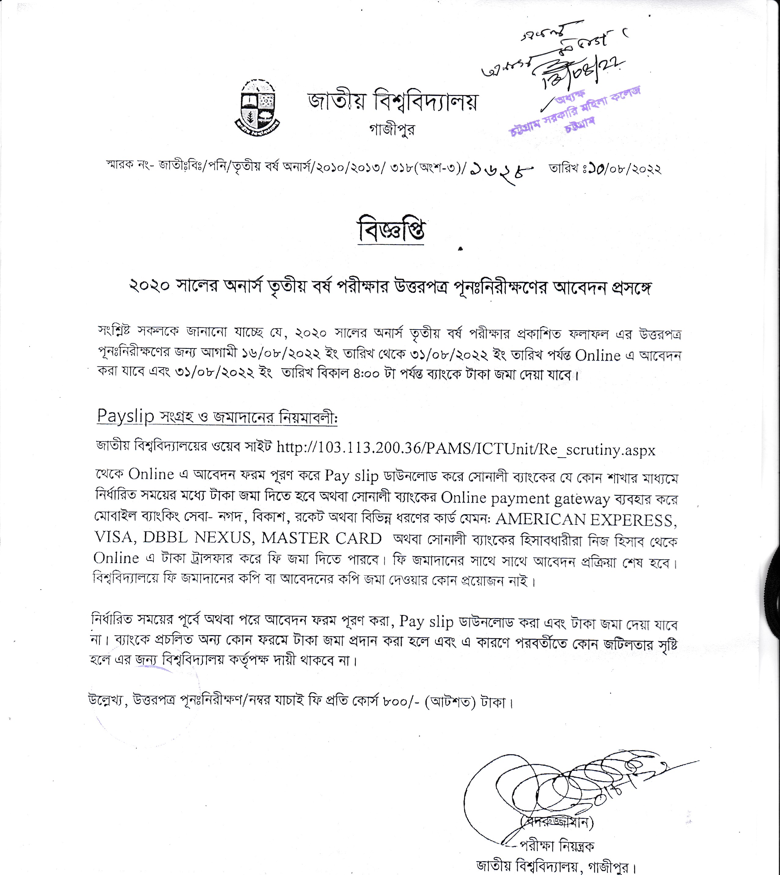 ২০২০ সালের অনার্স ৩য় বর্ষের ফলাফল পূনঃনিরীক্ষণের বিজ্ঞপ্তি (১৩/০৮/২০২২)
