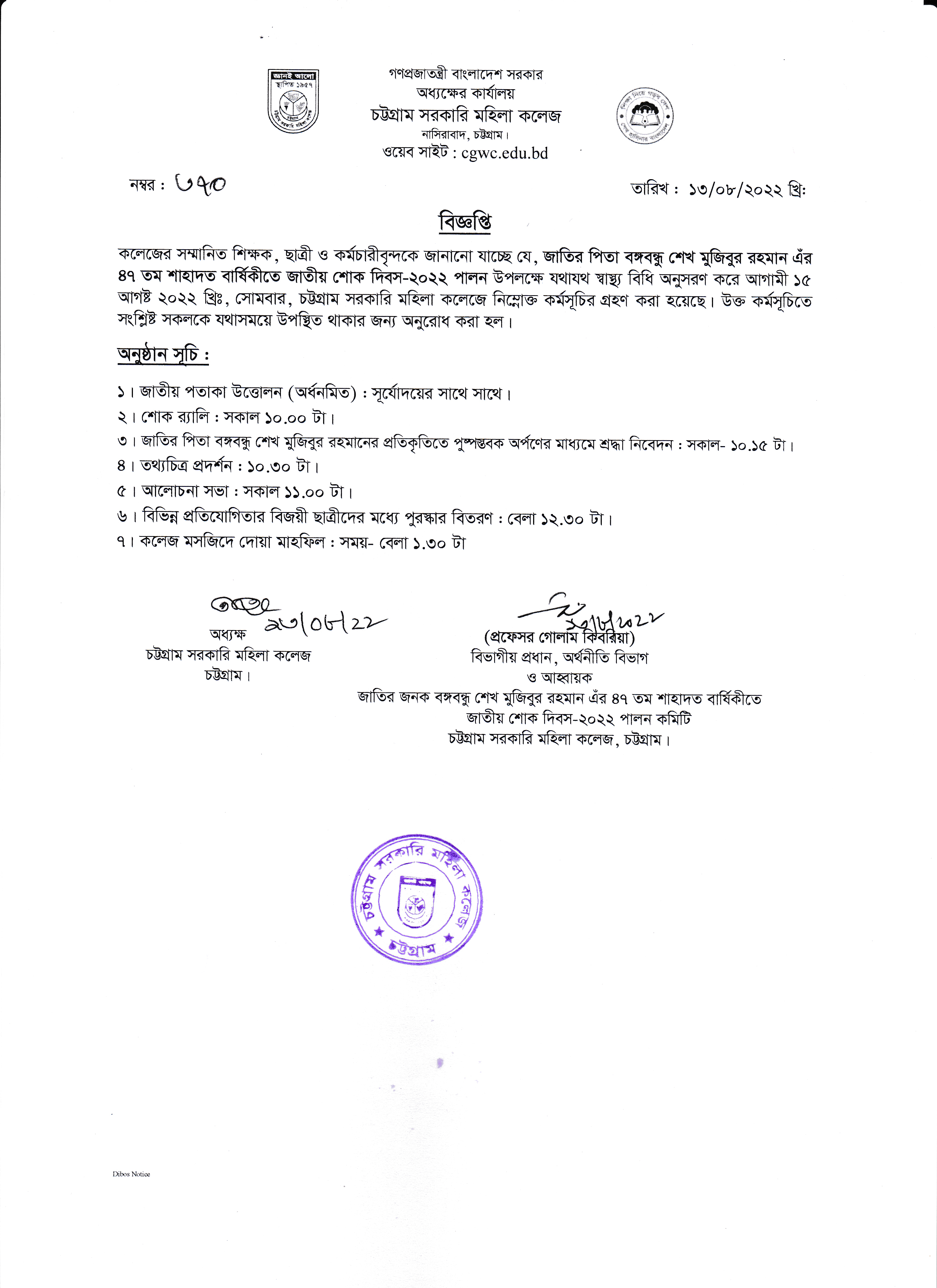 জাতির পিতা বঙ্গবন্ধু শেখ মুজিবুর রহমানের ৪৭তম শাহাদত বার্ষিকীতে ‘জাতীয় শোক দিবস-২০২২’ উপলক্ষে কলেজে কর্মসূচি গ্রহণ সংক্রান্ত বিজ্ঞপ্তি (১৩.০৮.২০২২ খ্রিঃ)