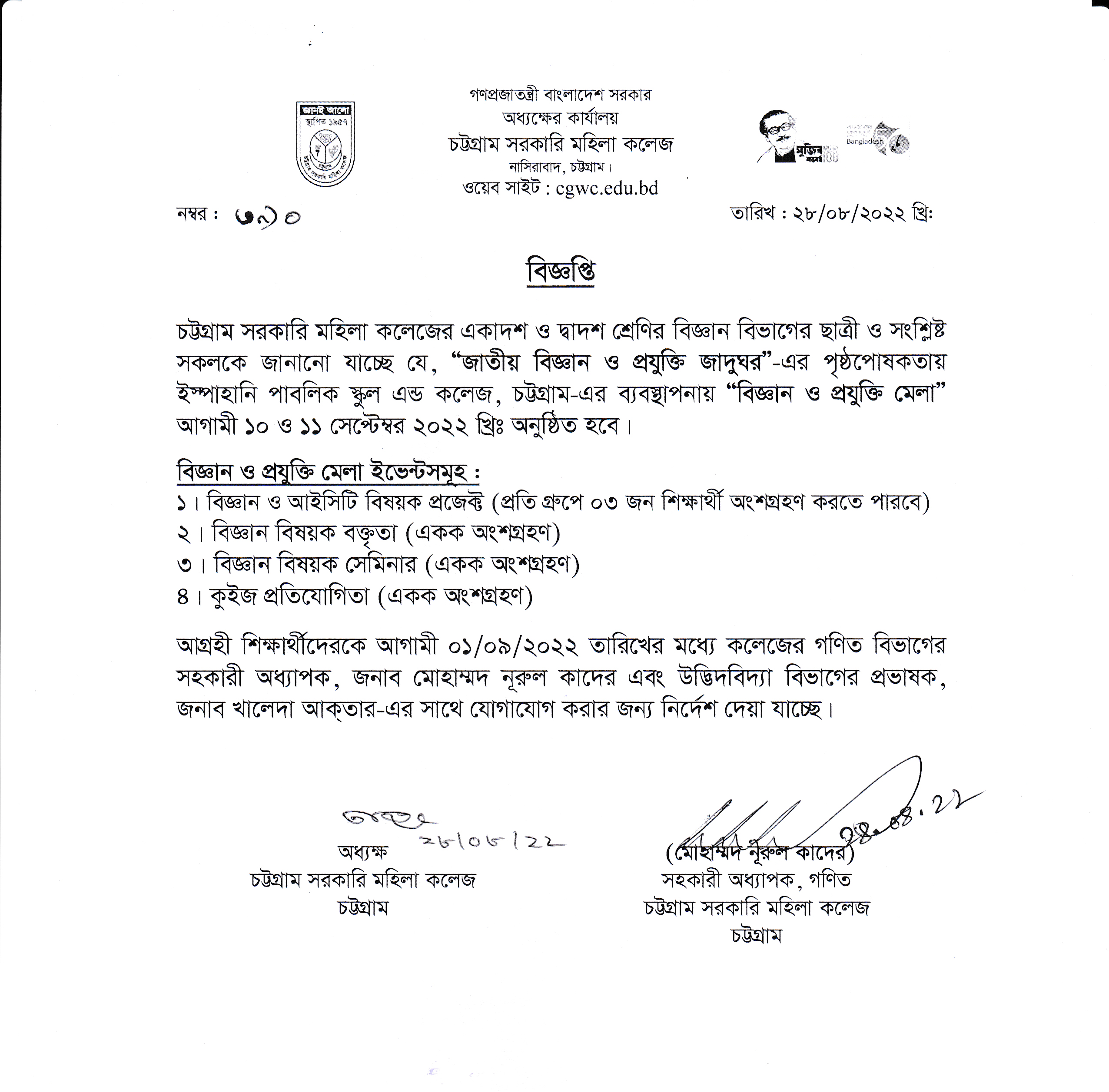 বিজ্ঞান ও প্রযুক্তি মেলার আয়োজন সংক্রান্ত বিজ্ঞপ্তি (২৮.০৮.২০২২ খ্রিঃ)
