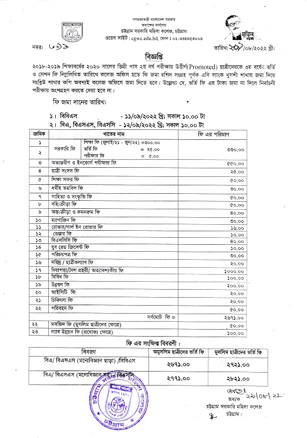 ২০১৮-২০১৯ শিক্ষাবর্ষের ২০২০ সালের ডিগ্রী (পাস) ২য় বর্ষ পরীক্ষায় উত্তীর্ণ ছাত্রীদের ৩য় বর্ষে ভর্তি ও সেশন ফি জমা দেয়ার বিজ্ঞপ্তি (২৯/০৮/২০২২)
