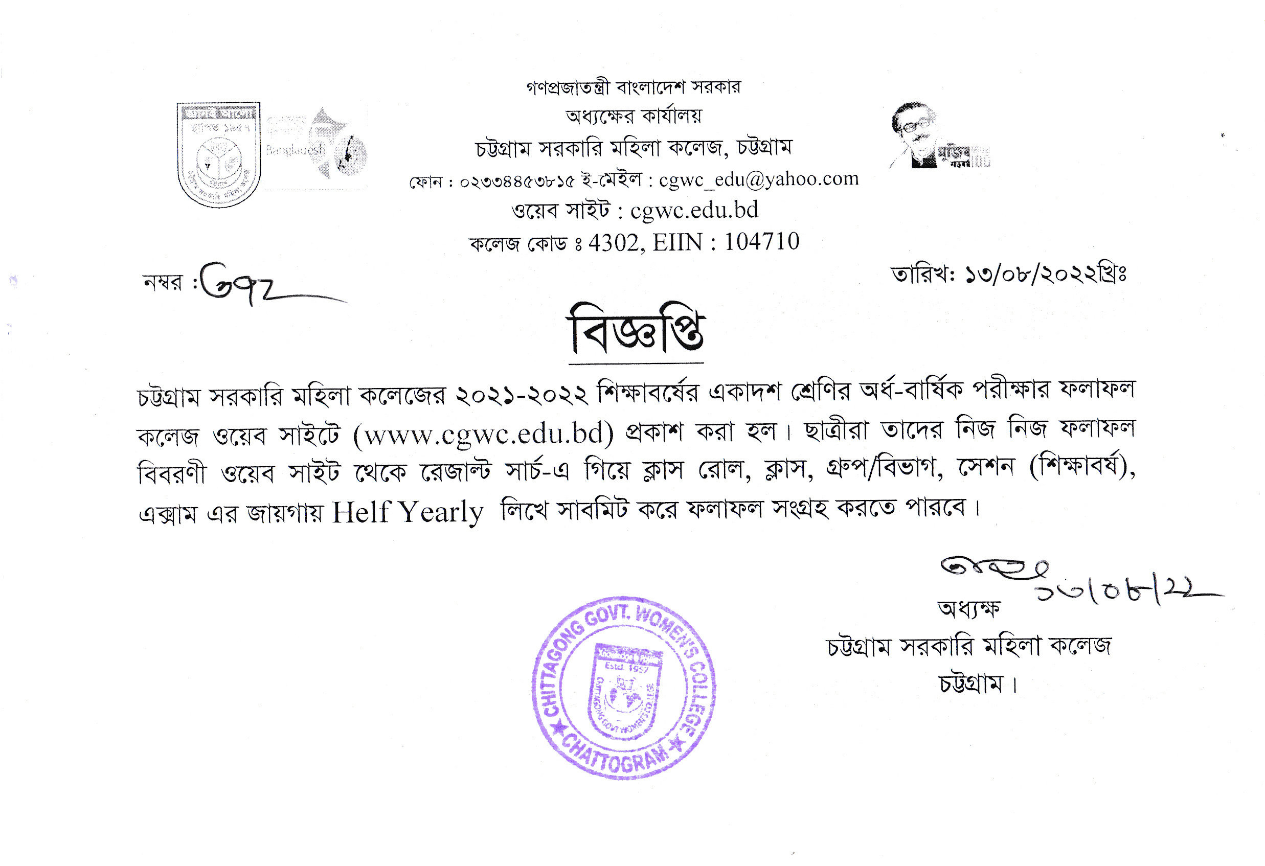 ২০২১-২০২২ শিক্ষাবর্ষের একাদশ শ্রেণির অর্ধ-বার্ষিক পরীক্ষা ফলাফল প্রকাশ সংক্রান্ত বিজ্ঞপ্তি (১৪.০৮.২০২২ খ্রিঃ)