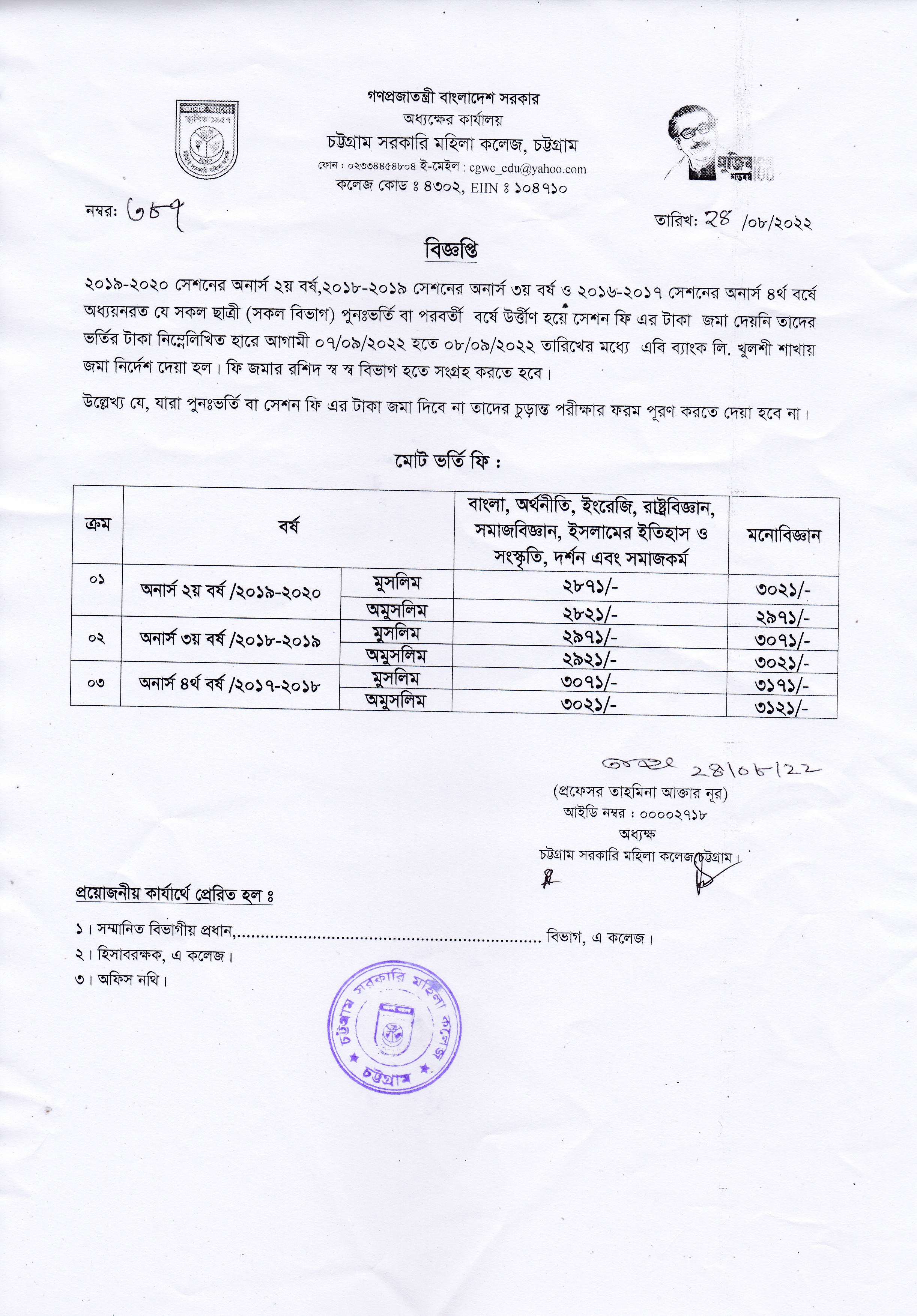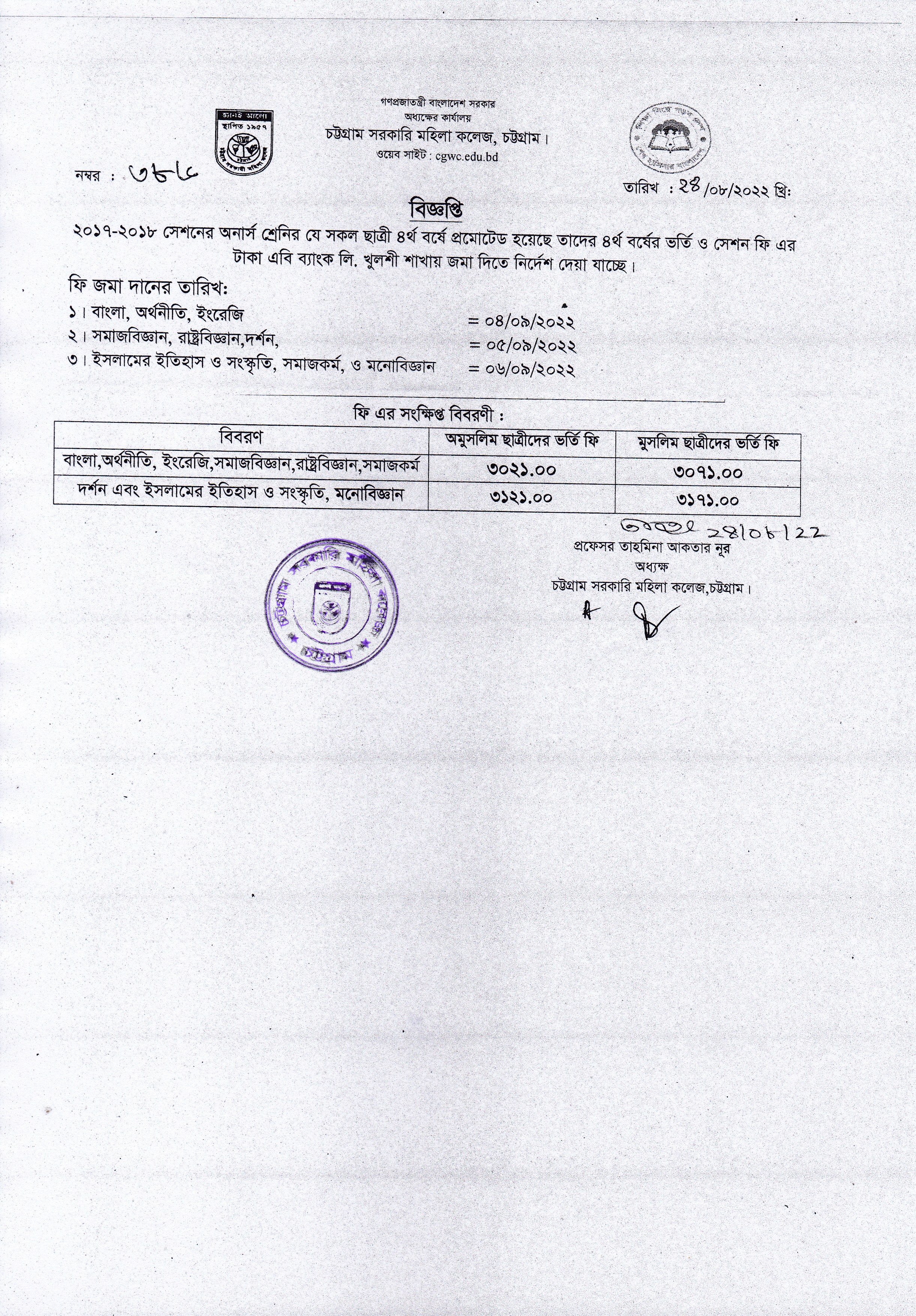 ২০১৭-২০১৮ শিক্ষাবর্ষে অনার্স ৪র্থ বর্ষের ছাত্রীদের ভর্তি ও সেশন ফি জমা দেয়ার বিজ্ঞপ্তি (২৪/০৮/২০২২)