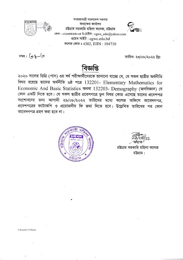 ২০২০ সালের ডিগ্রি (পাস) ৩য় বর্ষ পরীক্ষার প্রবেশপত্রে বিষয় কোড সংশোধন সংক্রান্ত বিজ্ঞপ্তি (২৩/০৮/২০২২)