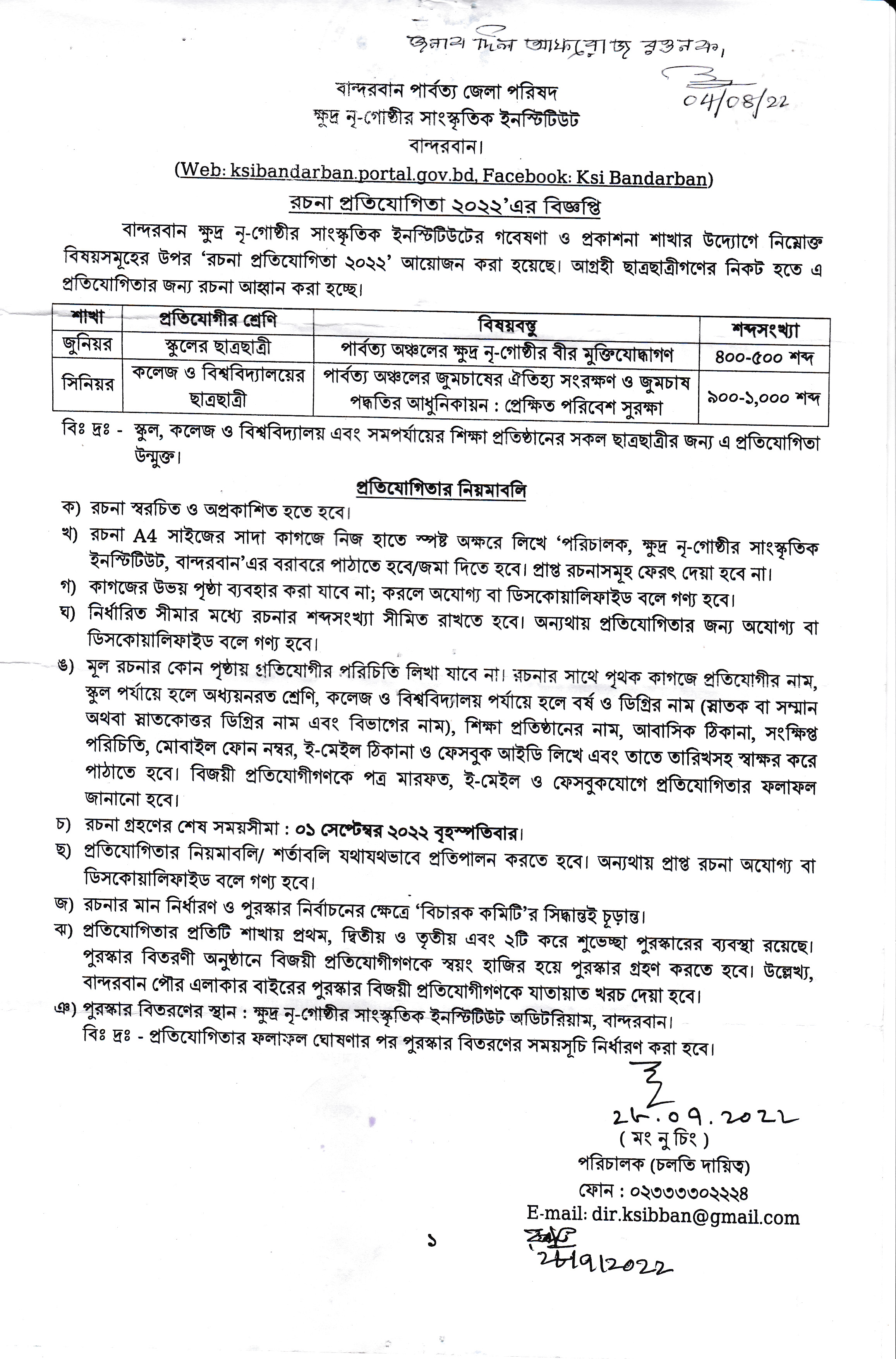 বান্দরবান ক্ষুদ্র নৃ-গোষ্ঠীর সাংস্কৃতিক ইনস্টিটিউটের গবেষণা ও প্রকাশনা শাখার উদ্যোগে ‘রচনা প্রতিযোগিতা-২০২২’ আয়োজন সংক্রান্ত বিজ্ঞপ্তি (০৭.০৮.২০২২ খ্রিঃ)