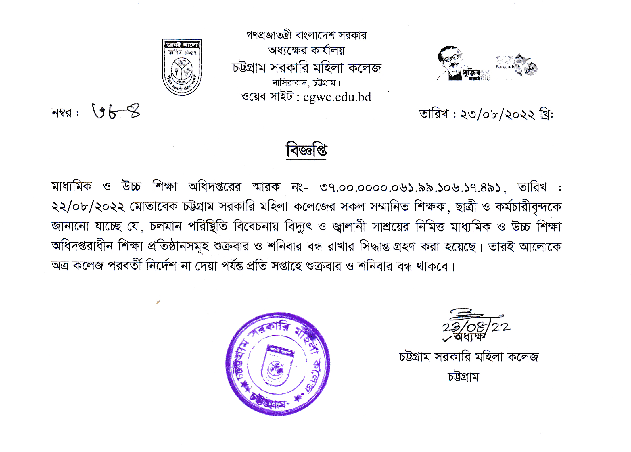 কলেজ শুক্রবার ও শনিবার বন্ধ থাকার বিজ্ঞপ্তি প্রকাশ (২৩.০৮.২০২২ খ্রিঃ)