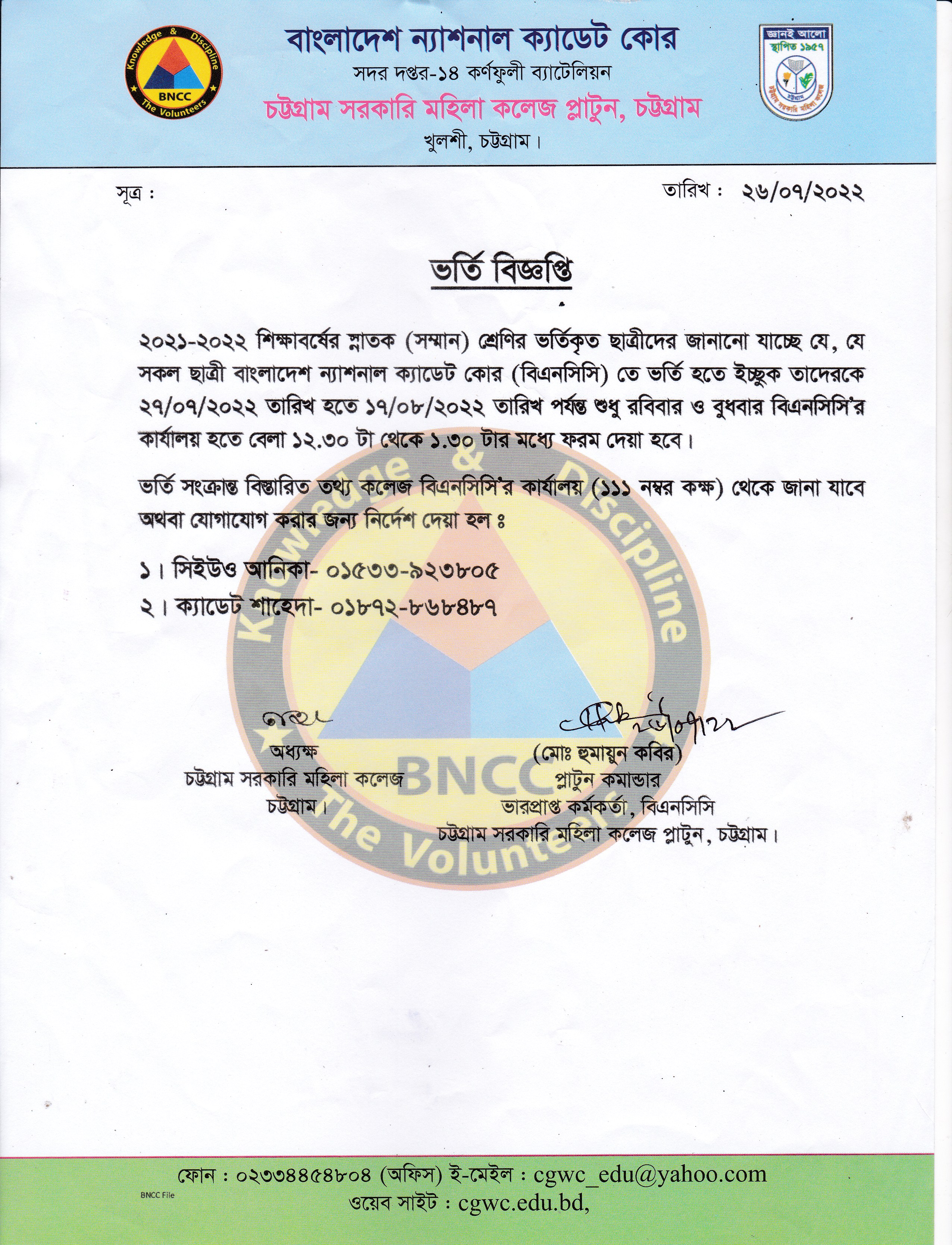 ২০২১-২০২২ শিক্ষাবর্ষে অনার্স ১ম বর্ষে ভর্তিকৃত ছাত্রীদের বিএনসিসিতে ভর্তি বিজ্ঞপ্তি প্রকাশ (০৭/০৮/২০২২)
