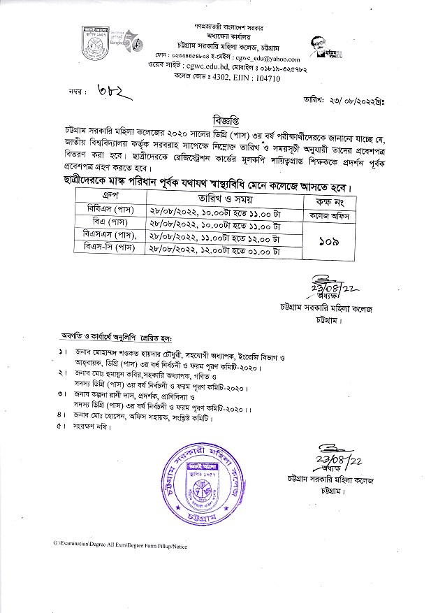 ২০২০ সালের ডিগ্রি (পাস) ৩য় বর্ষ পরীক্ষার প্রবেশপত্র বিতরণ সংক্রান্ত বিজ্ঞপ্তি (২৩/০৮/২০২২)