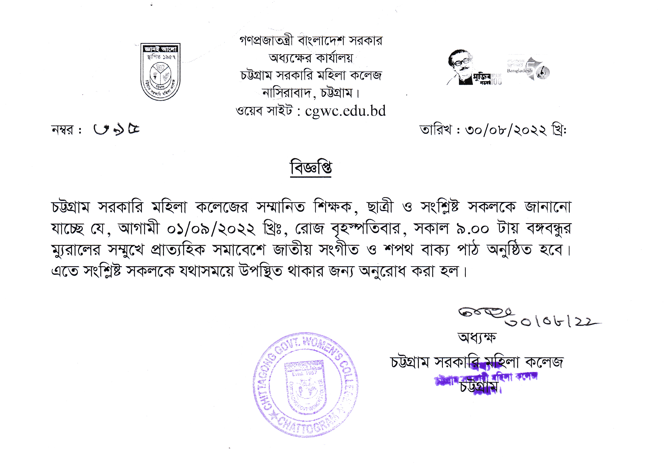 কলেজে প্রাত্যহিক সমাবেশে জাতীয় সংগীত ও শপথ বাক্য পাঠ অনুষ্ঠান সংক্রান্ত বিজ্ঞপ্তি (৩০.০৮.২০২২ খ্রিঃ)