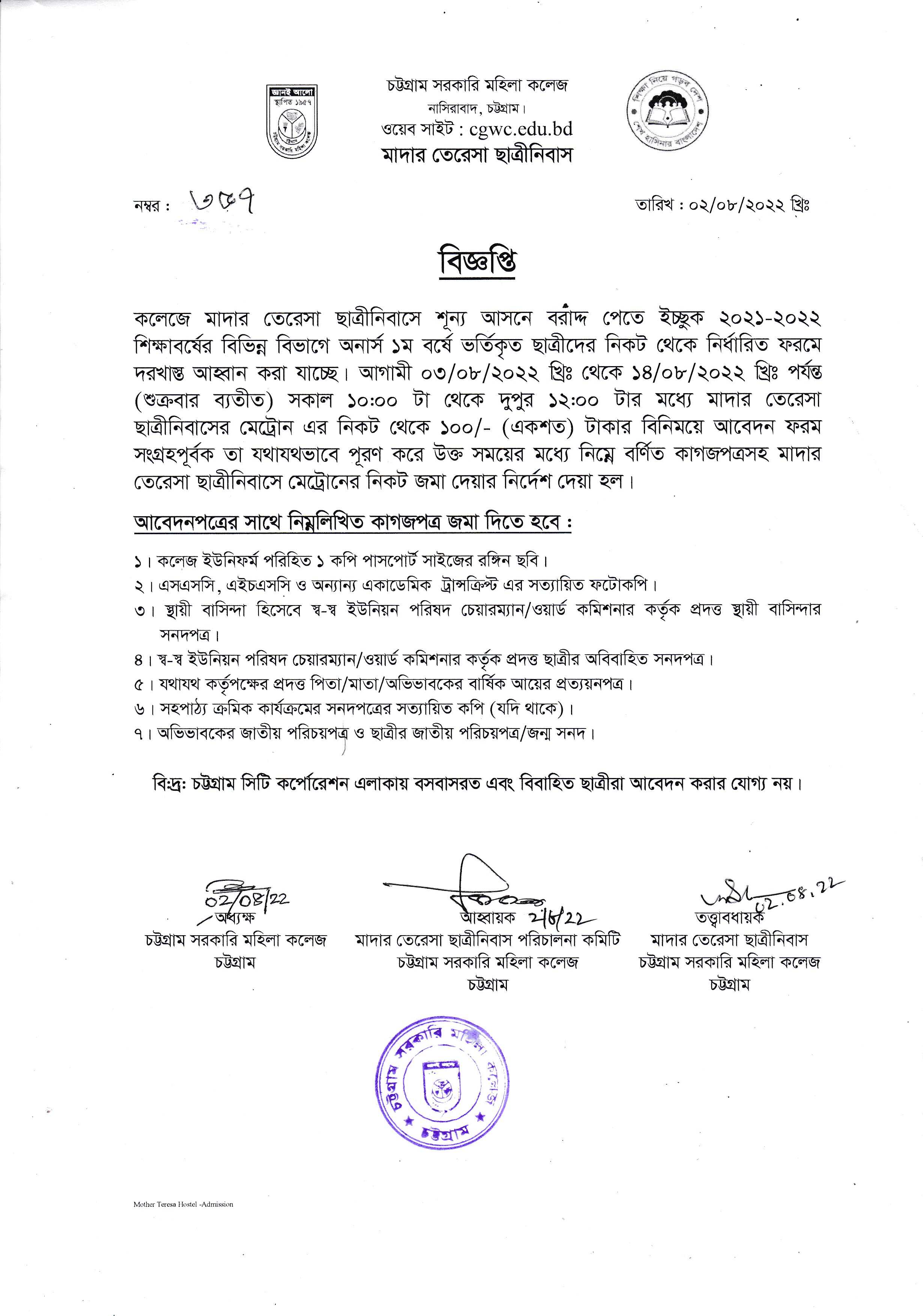 মাদার তেরেসা ছাত্রী নিবাসে শূণ্য আসনে সিট বরাদ্দ দেয়ার বিজ্ঞপ্তি (০২/০৮/২০২২)