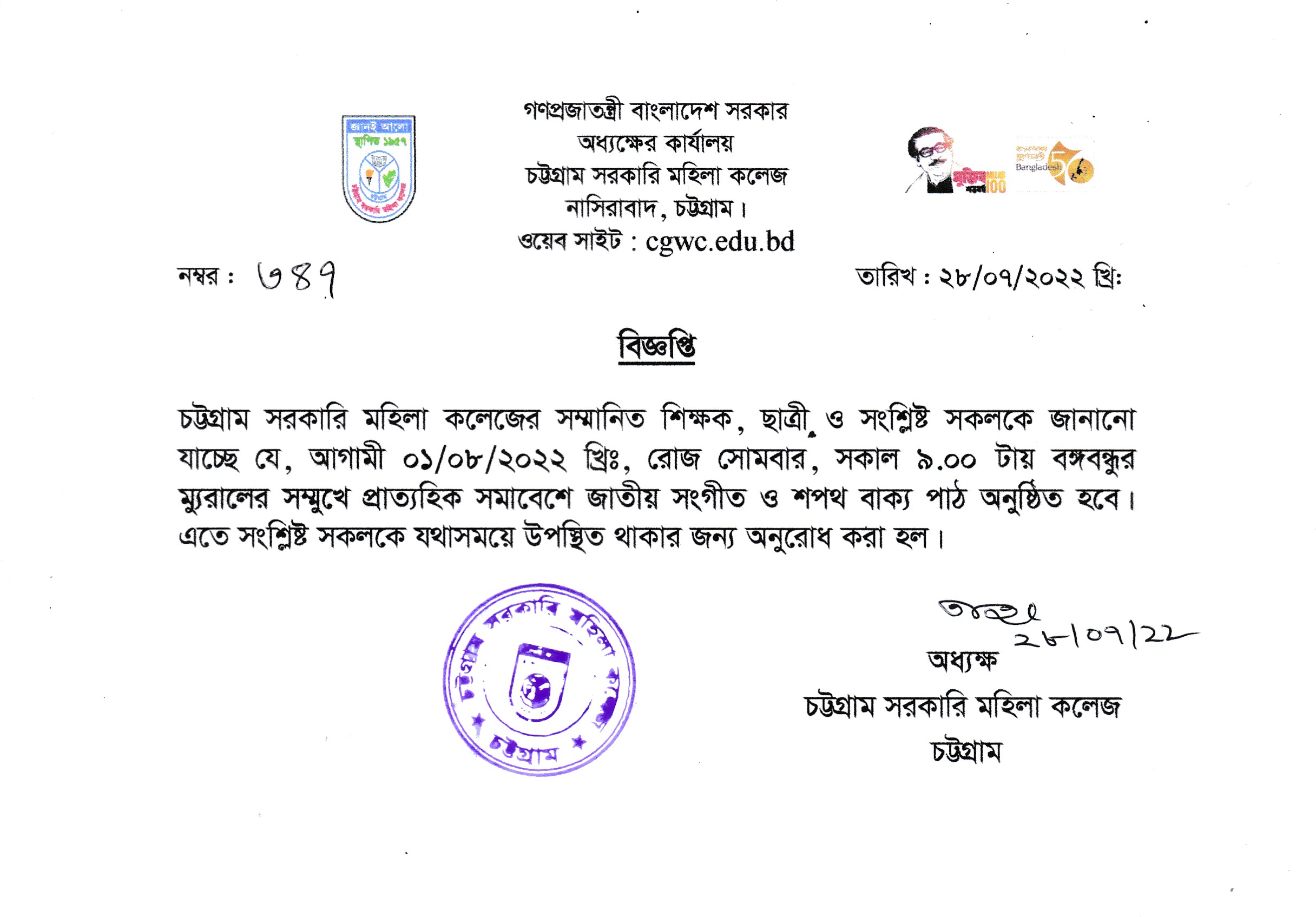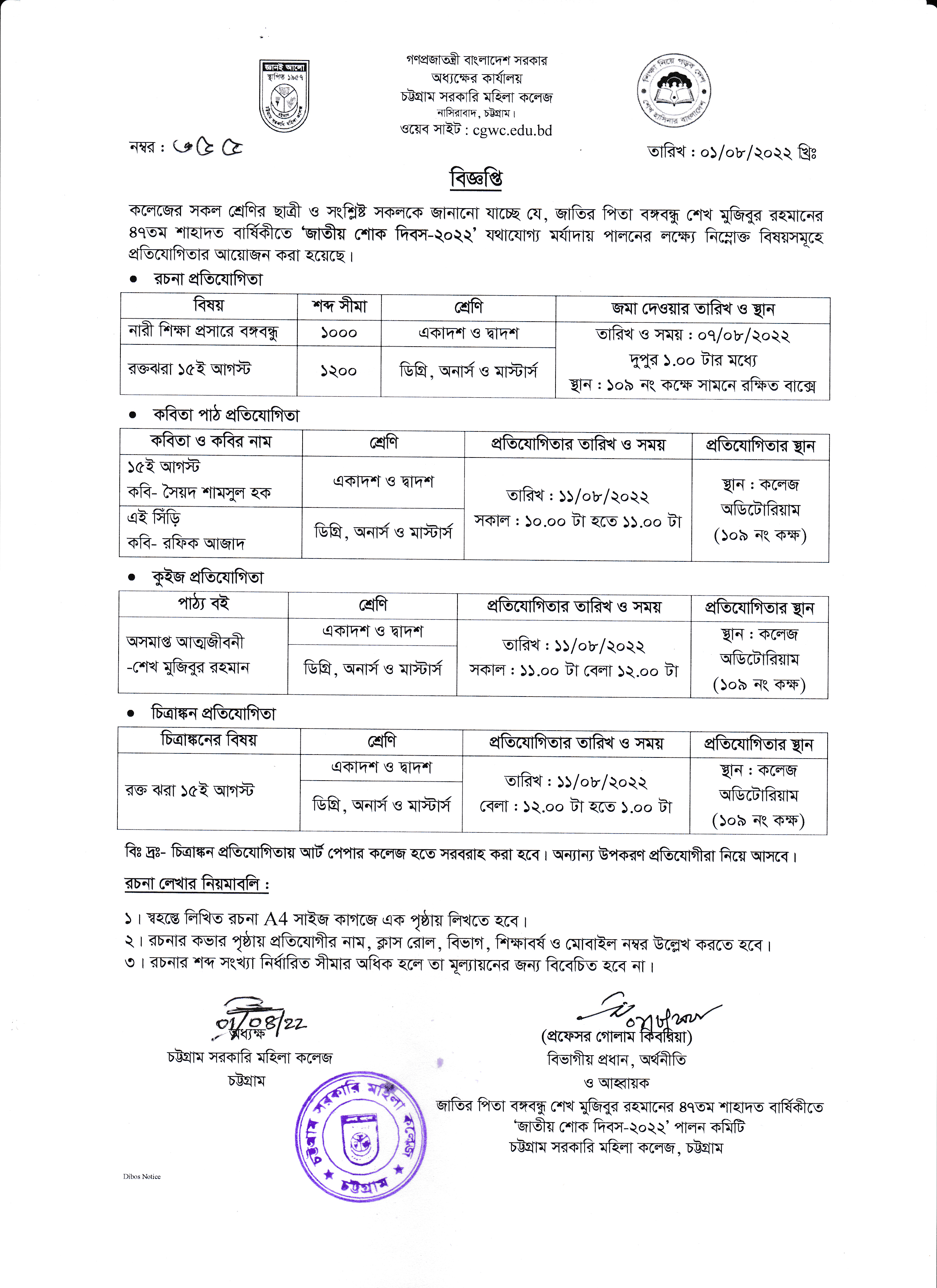 জাতির পিতা বঙ্গবন্ধু শেখ মুজিবুর রহমানের ৪৭তম শাহাদত বার্ষিকীতে ‘জাতীয় শোক দিবস-২০২২’ উপলক্ষে কলেজে বিভিন্ন প্রতিযোগিতার আয়োজন সংক্রান্ত বিজ্ঞপ্তি (০১.০৮.২০২২ খ্রিঃ)