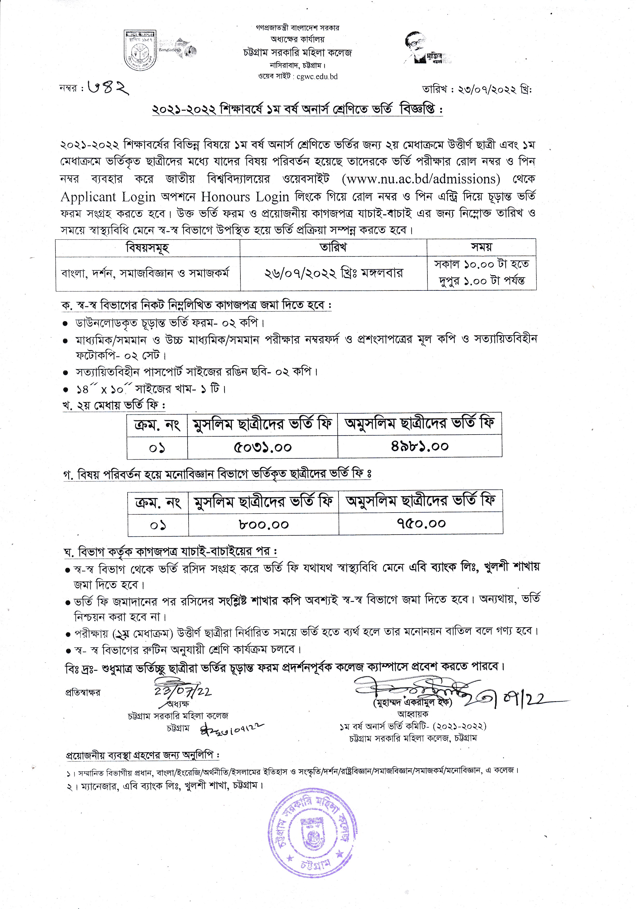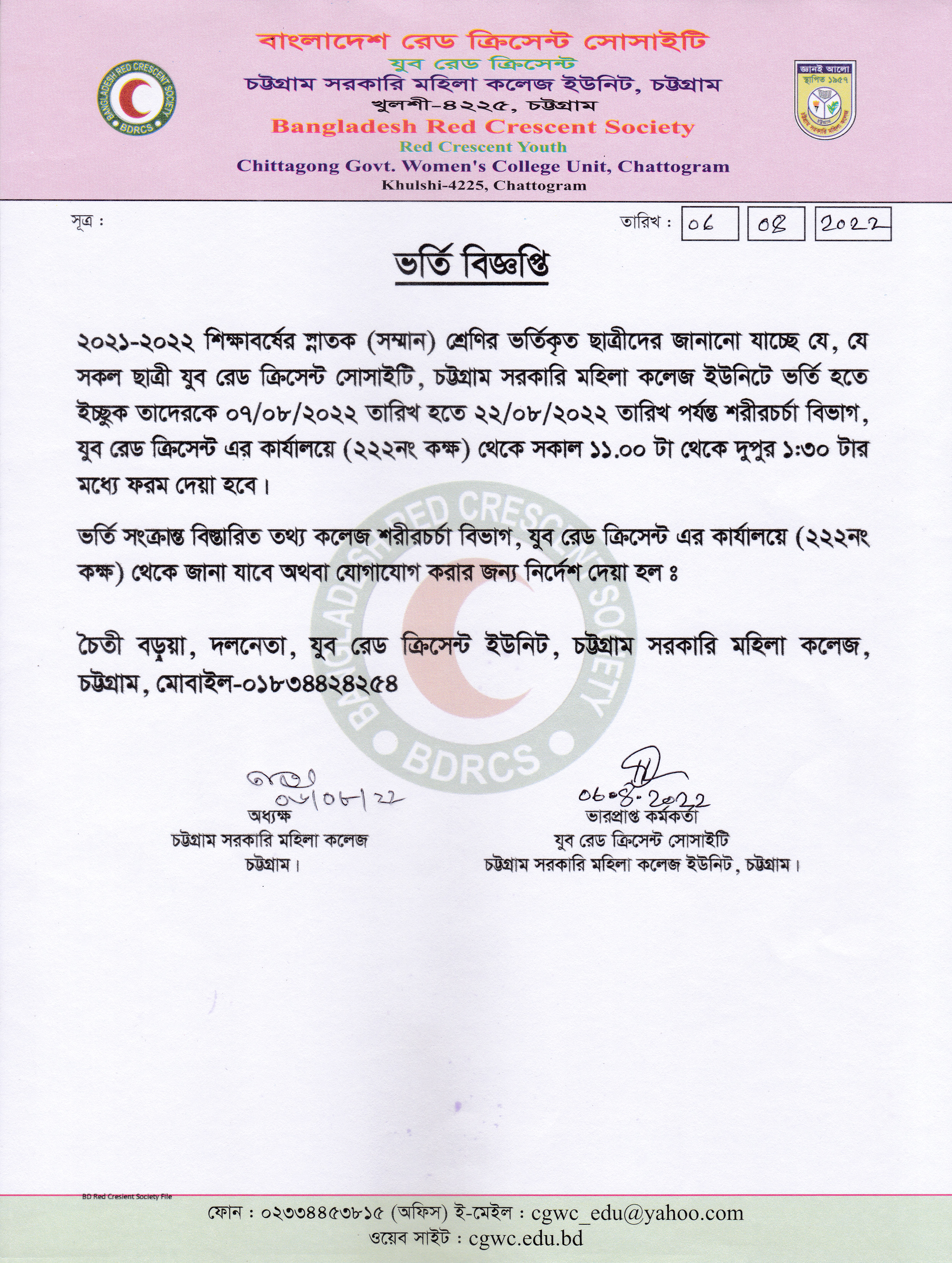 ২০২১-২০২২ শিক্ষাবর্ষের স্নাতক (সম্মান) শ্রেণির যুব রেড ক্রিসেন্ট ইউনিট, চট্টগ্রাম সরকারি মহিলা কলেজ, চট্টগ্রামে ভতি সংক্রান্ত বিজ্ঞপ্তি