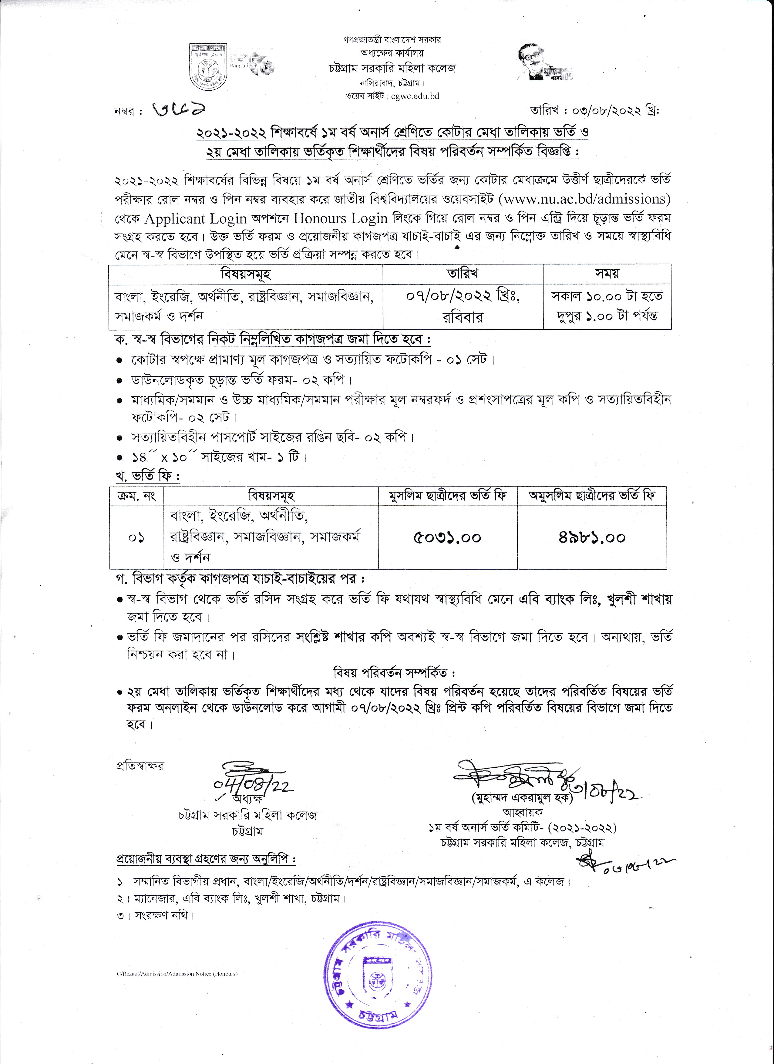 ২০২১-২০২২ শিক্ষাবর্ষে অনার্স প্রথম বর্ষে কোটায় ভর্তি ও ২য় মেধাতালিকায় বিষয় পরিবর্তন এর বিজ্ঞপ্তি (০৪/০৮/২০২২)