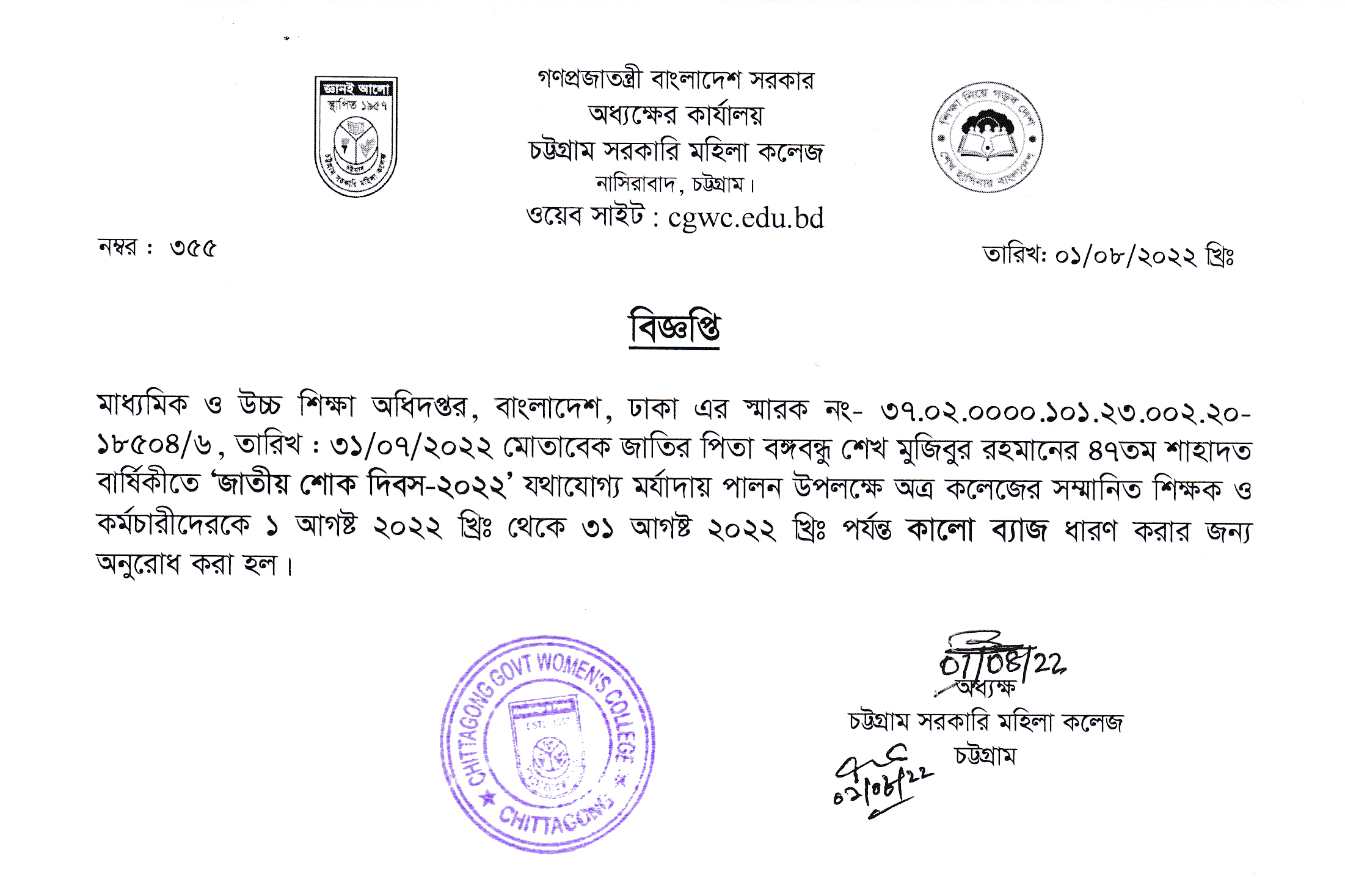 জাতির পিতা বঙ্গবন্ধু শেখ মুজিবুর রহমানের ৪৭তম শাহাদত বার্ষিকীতে ‘জাতীয় শোক দিবস-২০২২’ উপলক্ষে কালো ব্যাজ ধারণ সংক্রান্ত বিজ্ঞপ্তি (০১.০৮.২০২২ খ্রিঃ)