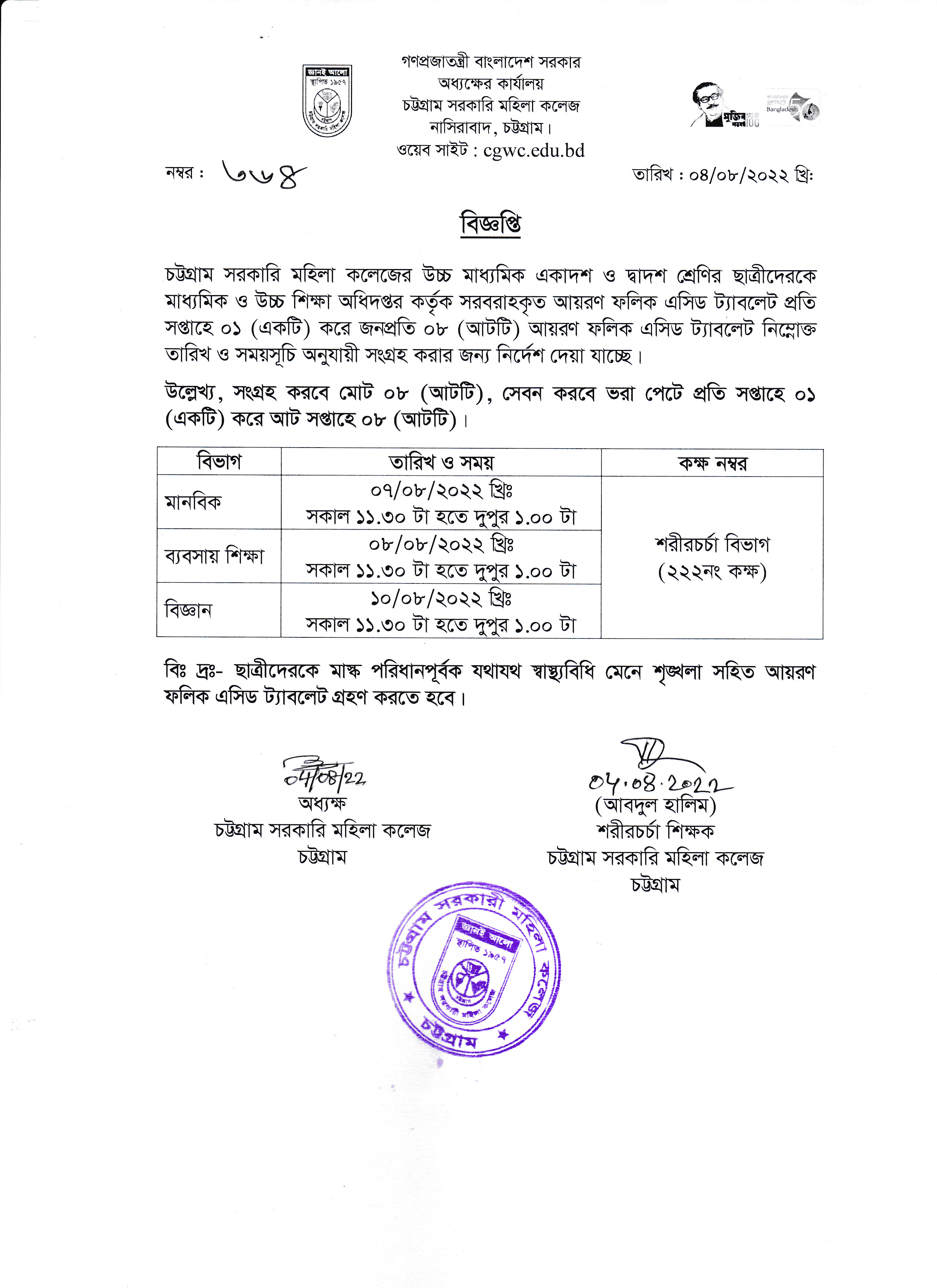 কলেজে একাদশ ও দ্বাদশ শ্রেণির ছাত্রীদের মধ্যে আয়রণ ফলিক এসিড ট্যাবলেট বিতরণ সংক্রান্ত বিজ্ঞপ্তি (০৪.০৮.২০২২ খ্রিঃ)