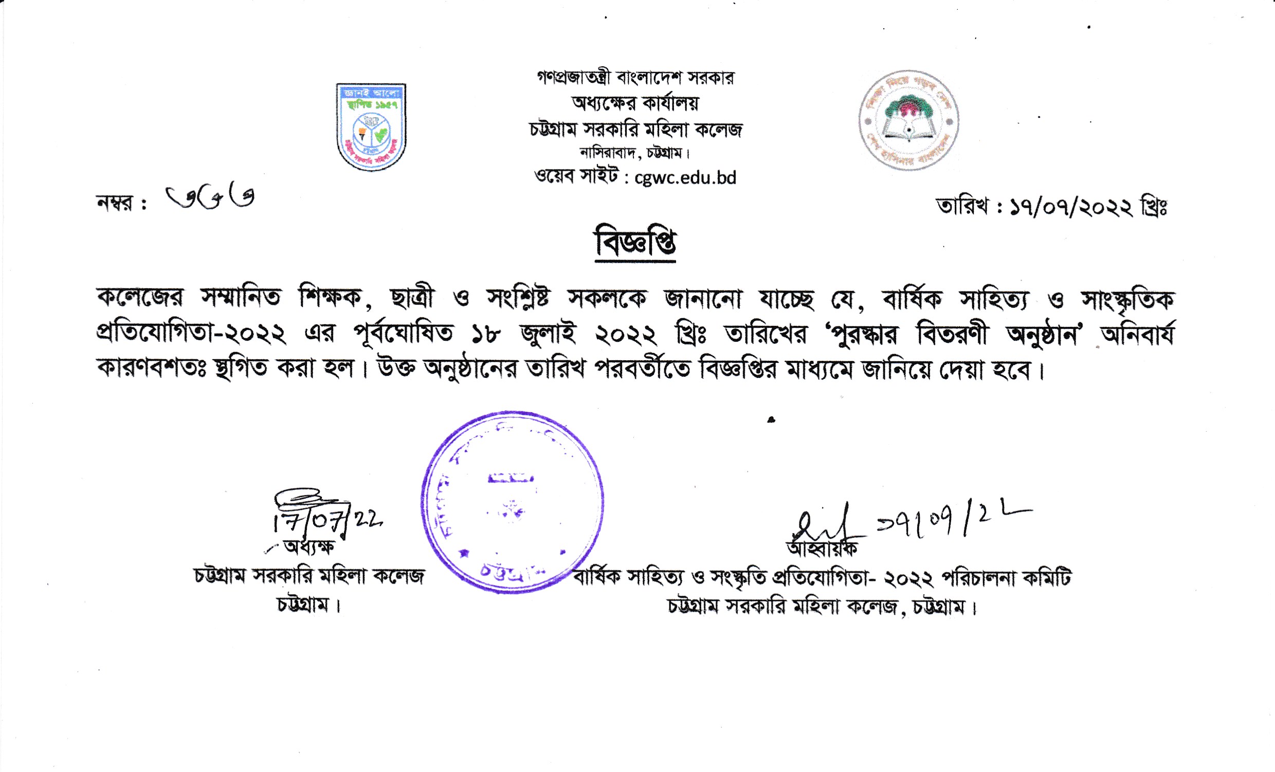 বার্ষিক সাহিত্য ও সাংস্কৃতিক প্রতিযোগিতা-২০২২ এর পুরস্কার বিতরণী অনুষ্ঠান স্থগিত সংক্রান্ত বিজ্ঞপ্তি (১৭/০৭/২০২২)