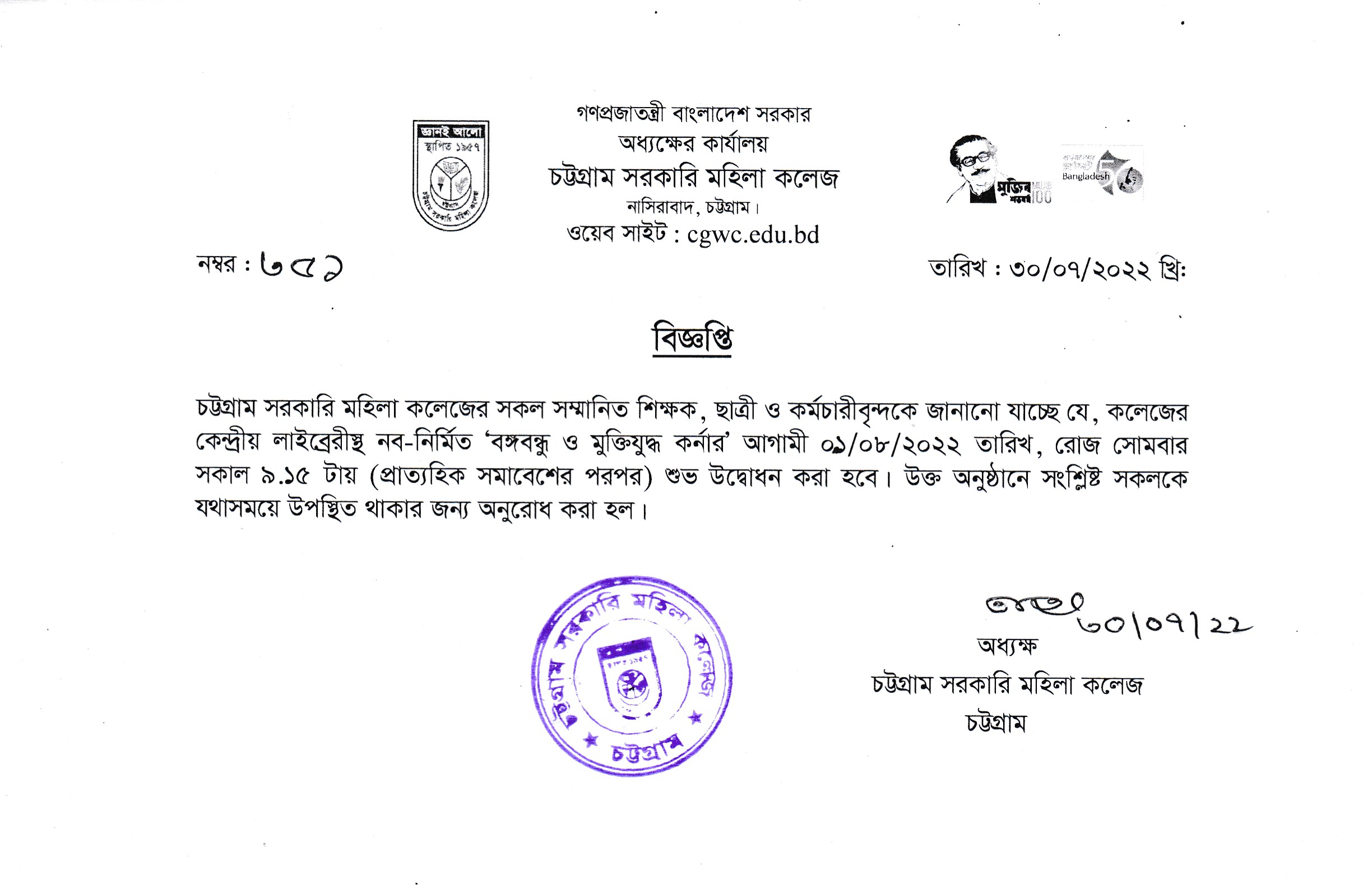 কলেজের কেন্দ্রিয় লাইব্রেরীতে বঙ্গবন্ধু কর্ণার শুভ উদ্বোধন এর বিজ্ঞপ্তি (৩০/০৭/২০২২)