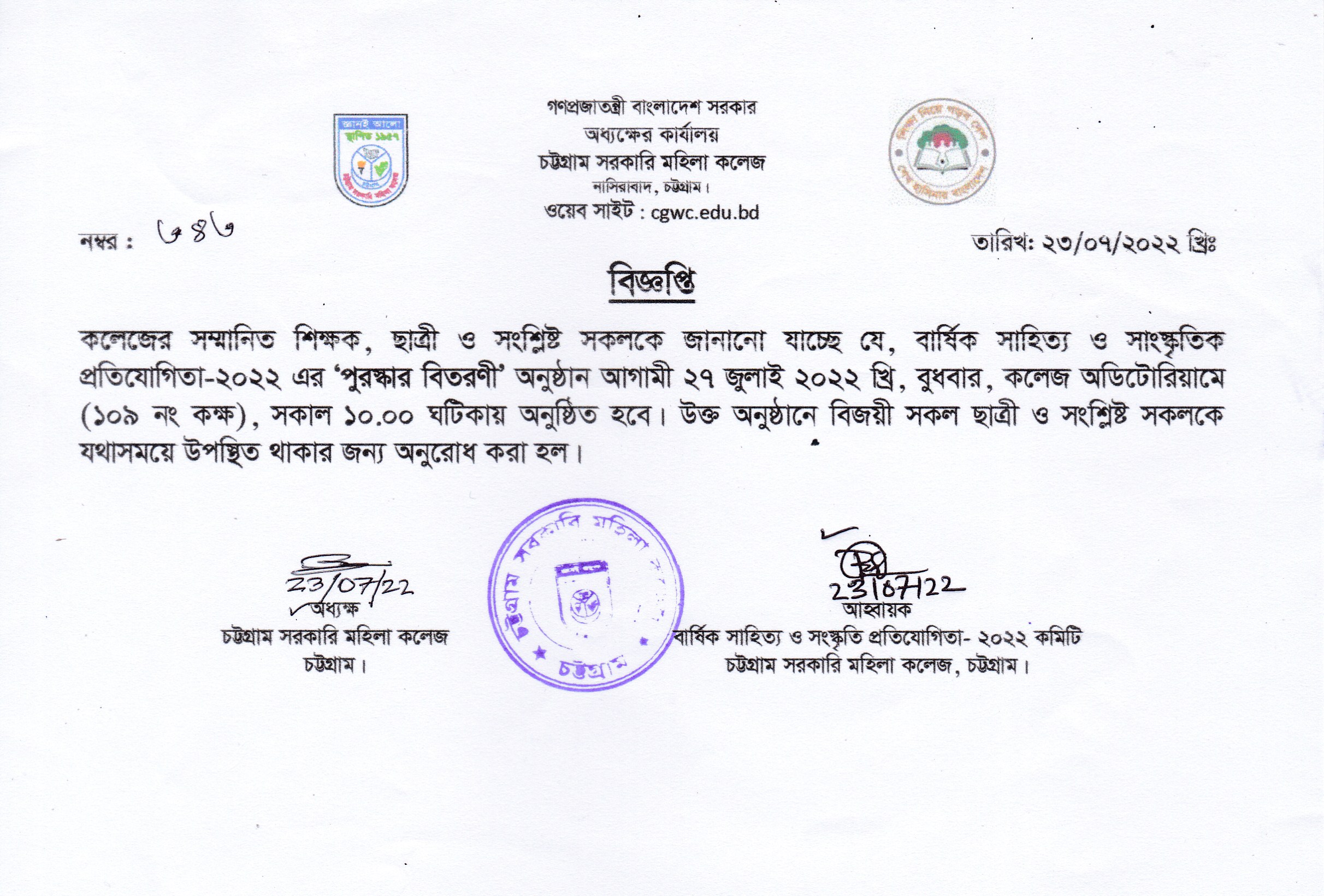 বার্ষিক সাহিত্য ও সাংস্কৃতিক প্রতিযোগিতা-২০২২ এর পুরস্কার বিতরণী অনুষ্ঠান এর বিজ্ঞপ্তি (২৩/০৭/২০২২)