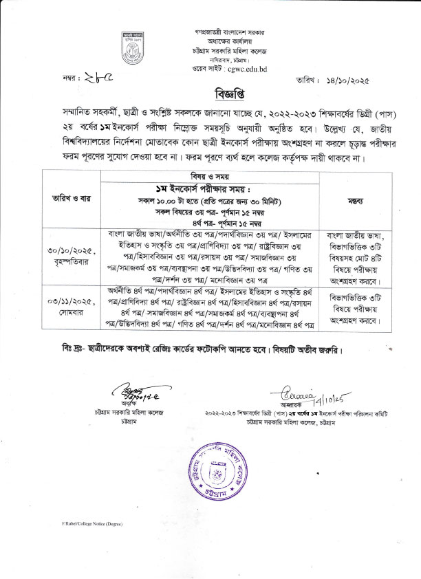 ২০২২-২০২৩ শিক্ষাবর্ষের ডিগ্রী (পাস) ২য় বর্ষের ১ম ইনকোর্স পরীক্ষার সময়সূচি প্রকাশ