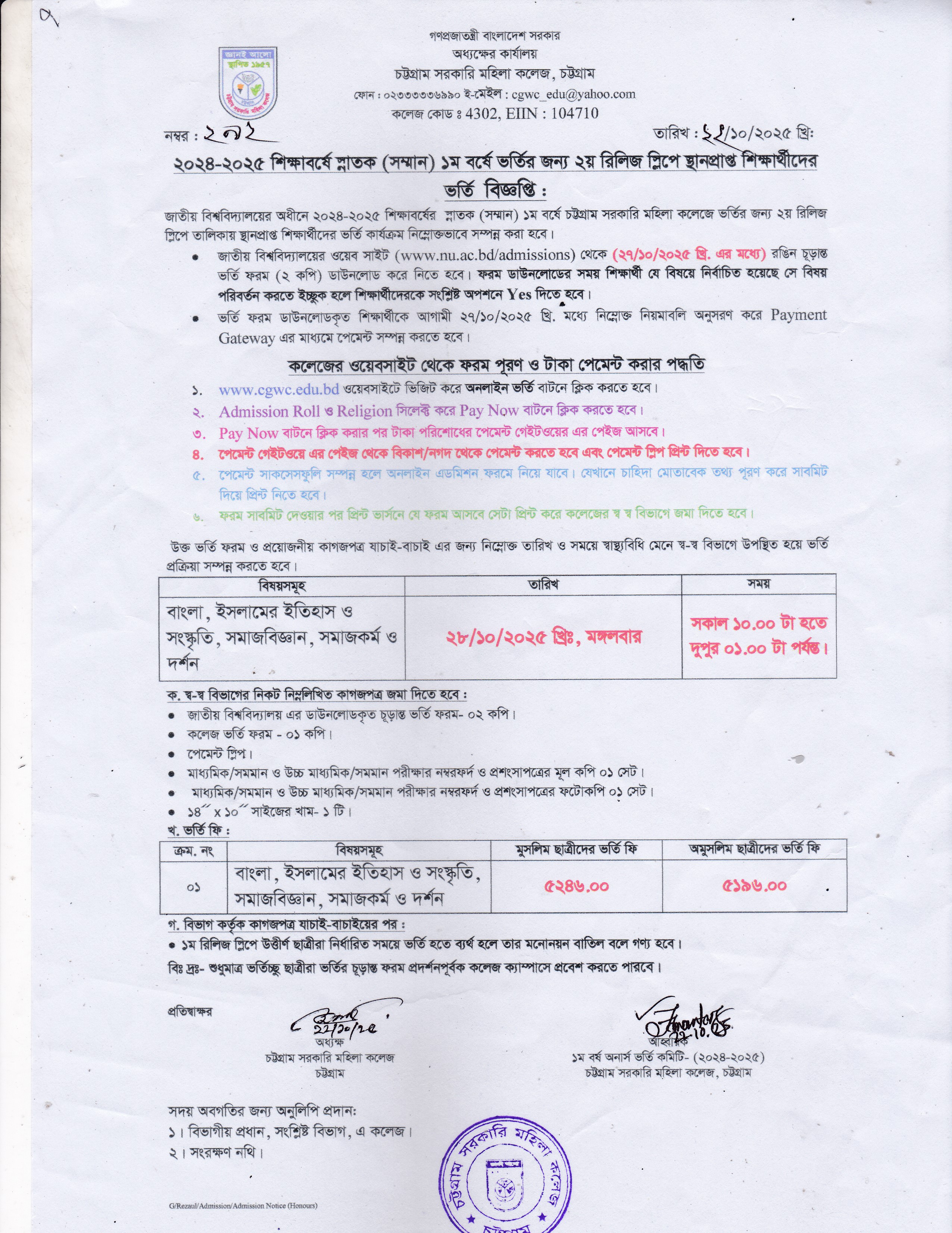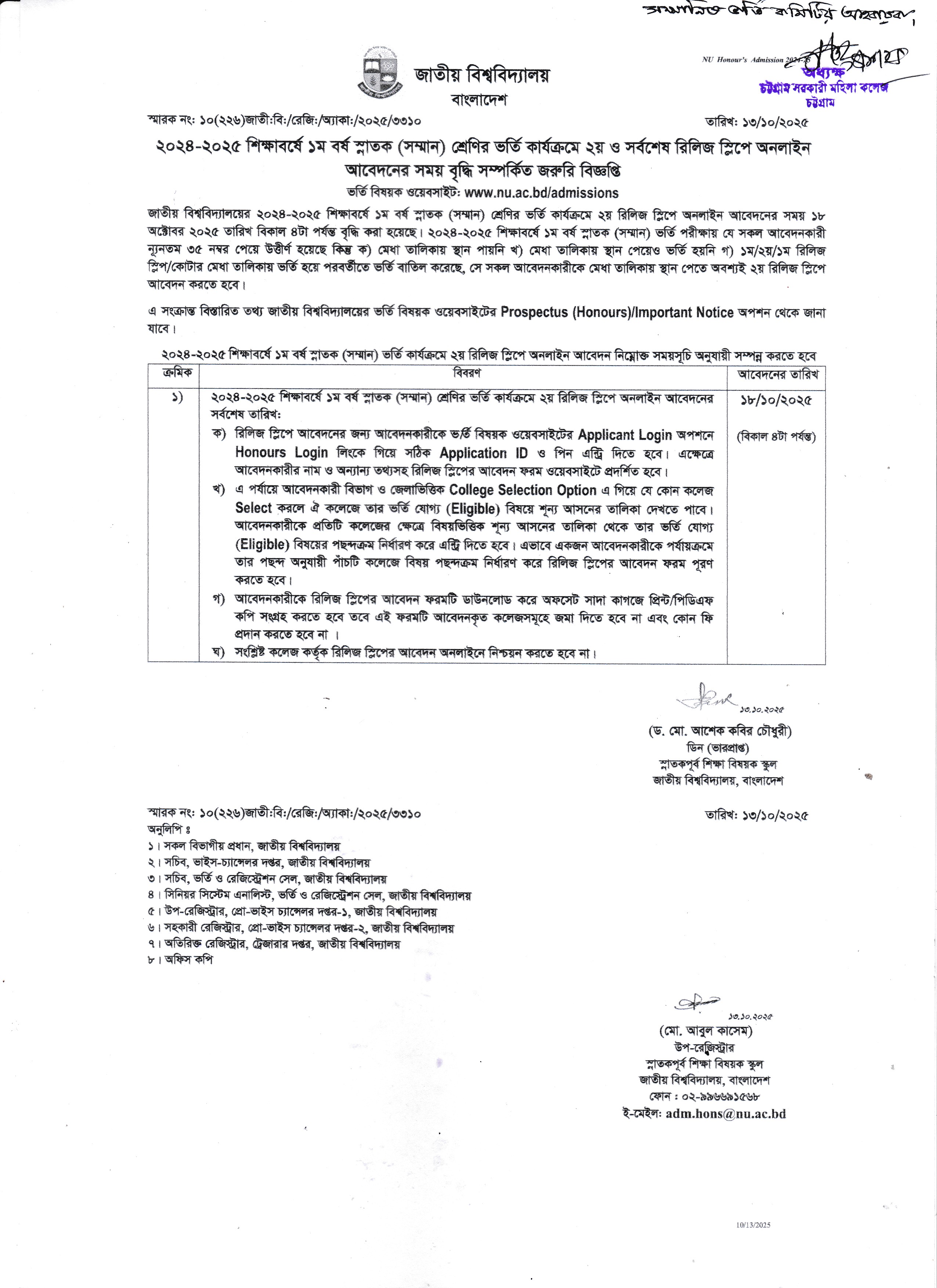 ২০২৪-২০২৫ শিক্ষাবর্ষে ১ম বর্ষ স্নাতক (সম্মান) শ্রেণির ভর্তির ২য় ও সর্বশেষ রিলিজ স্লিপে অনলাইন আবেদনের সময় বৃদ্ধি সংক্রান্ত জরুরি বিজ্ঞপ্তি