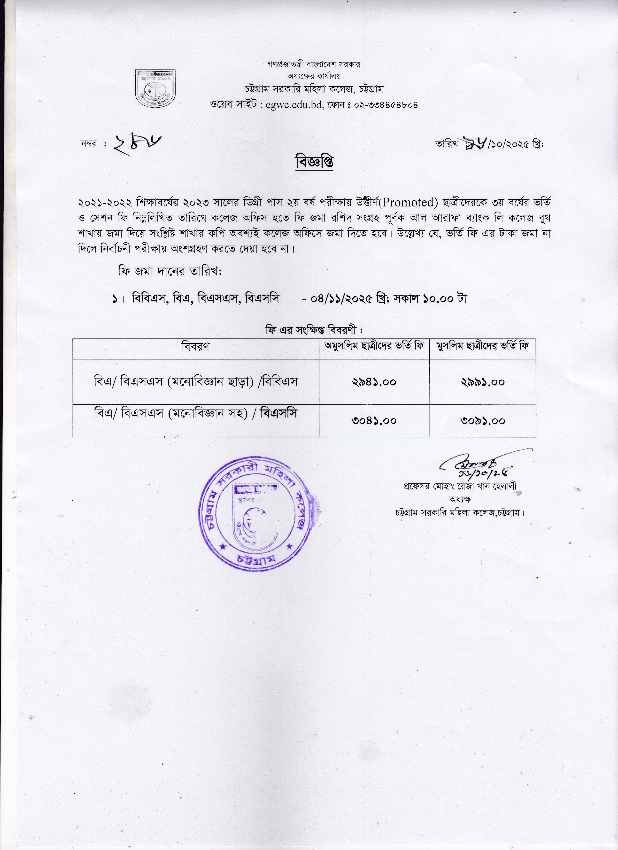 ২০২১-২০২২ শিক্ষাবর্ষে ২০২৩ সালের ডিগ্রি (পাস) ২য় বর্ষ পরীক্ষায় উত্তীর্ণ ছাত্রীদের ৩য় বর্ষের ভর্তি ও সেশন ফি জমাদান সংক্রান্ত বিজ্ঞপ্তি।
